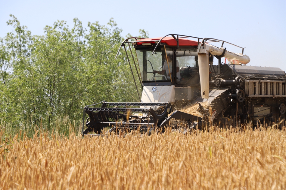 在小麦良种繁育示范田,农机手驾驶着收割机熟练地操作着,收割机前面的拨禾轮快速地将麦秆扶倒并收入机器,后面的割台将麦秆切断,麦粒则通过脱粒装置与麦秆分离,最后麦粒被装入车斗。不一会儿,一片麦田就被收割完毕,金黄的麦粒堆积如山,等待装车运往仓库。