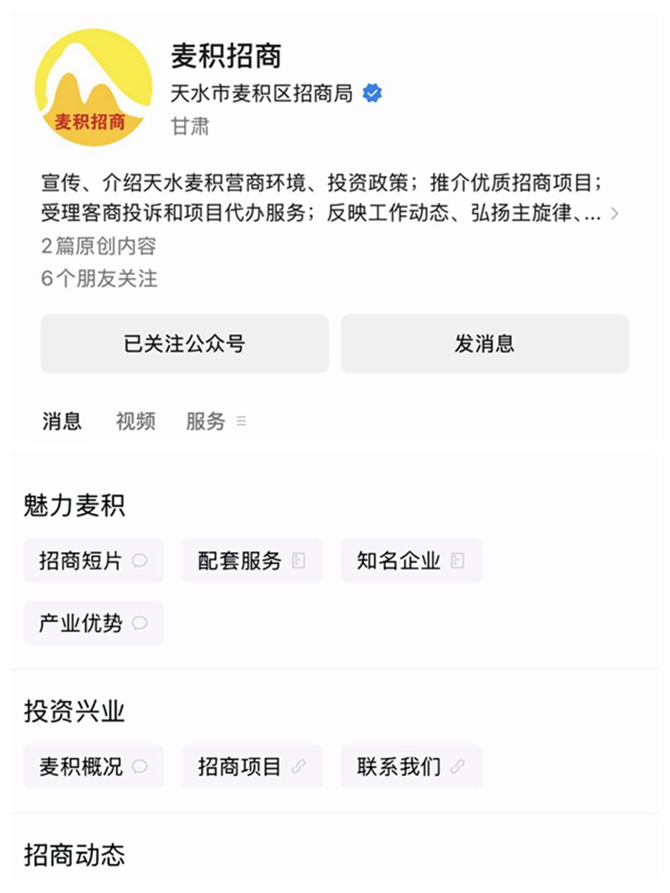创新方法拓招商。坚持科学规划,招商选资,确保招商项目的针对性和可操作性。认真研究国家产业政策和投资导向,立足区域资源和基础条件,持续加大项目谋划力度,合理优化产业布局,对标高端装备制造、数字经济、医药食品、新材料新能源、伏羲始祖文化和教育产业、建筑建材、现代农业、文旅农康、通道物流平台经济、节能环保等十大重点产业链,全面梳理更新招商投资机会清单,精准谋划产业链投资项目100个655亿元,重新设计制作了宣传折页、项目手册、投资指南,持续更新“麦积招商”微信公众号,今年截至目前刊发麦积动态22期,营造出了浓厚宣传氛围。