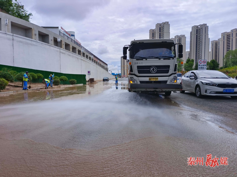 在会展中心、东十里片区等地,七里墩环卫所工人通过分段作业,对清扫出的垃圾和淤泥,清运车运走后,再利用冲洗车、洗扫车等机械设备,对雨后道路进行冲洗作业,确保路面干净整洁。