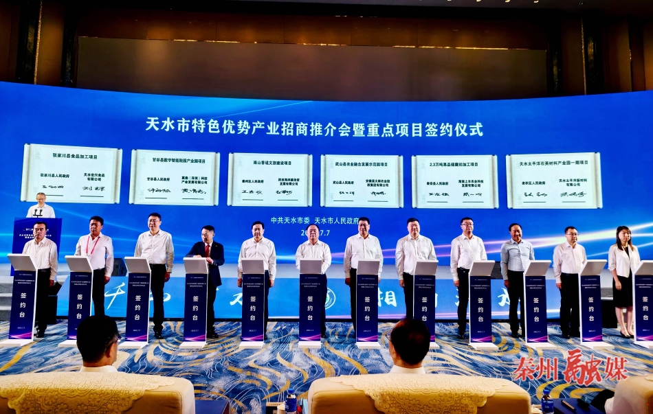 新天水讯 据秦州区融媒体中心消息 7月7日,第三十一届兰洽会天水市特色优势产业招商推介会暨重点项目签约仪式在兰州举行。秦州区共签约招商引资项目14项,总投资76.52亿元。区委副书记、区长王志成参加会议,区级相关领导及区直有关部门负责人代表秦州区和企业先后进行电子签约和现场签约。