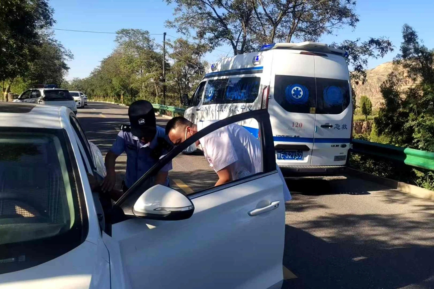 民警很快在磐石村与永安村交界路段发现该白色轿车。当时车辆轨迹异常,左右摇摆,随时可能发生事故。民警立即通过喇叭喊话引导其靠边停车。待车辆停稳,他们迅速上前查看,发现驾驶员面色苍白、双手颤抖、意识模糊,脚仍踩在油门上,情况万分危急。