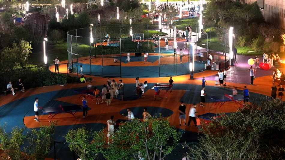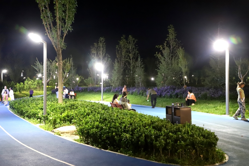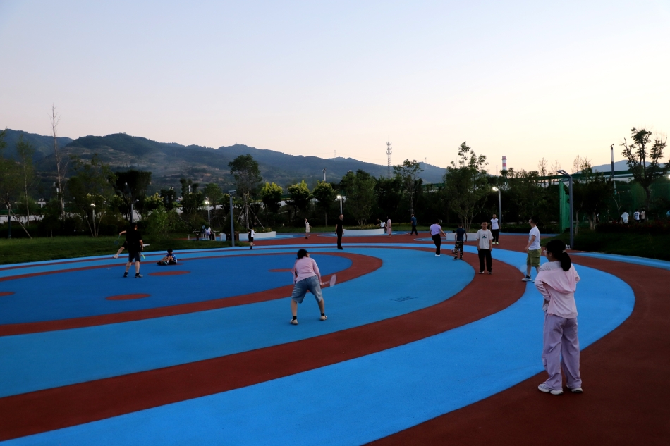 随着夜幕降临,公园里又是一番别样的景象。篮球场上,激烈的比赛正在上演,球员们你争我抢,每一次进球都引得观众阵阵欢呼;羽毛球场地里,轻盈的羽毛球在空中来回穿梭,乒乓球区域同样热闹,小小的乒乓球在球桌上来回跳跃,儿童区天真无邪的笑声回荡在公园上空,家长们则坐在一旁的休息长椅上,看着孩子们玩耍,脸上洋溢着幸福的笑容。“我家就在附近,这几天晚上吃完饭我和朋友过来散步、乘凉,公园里环境好、空气好,感觉很舒适,对于我们西城区的居民来说,方便了很多。”市民苏文莉说。