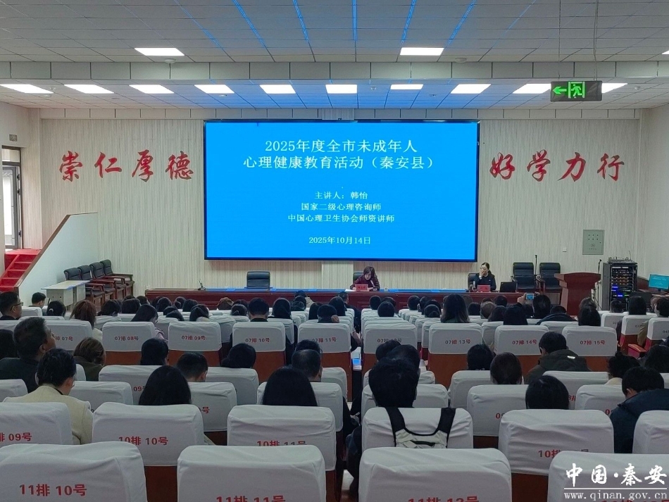 新天水讯 据秦安县融媒体中心消息 10月14日,“心向阳光·逐梦远航”2025年度全市未成年人心理健康教育活动在秦安县第二中学举办。活动邀请国家二级心理咨询师、中国心理卫生协会师资讲师韩怡开展专题辅导。秦安县委宣传部、县教育局相关负责人及秦安县各学区分管副校长、乡镇中心小学专兼职心理健康教师,局直学校分管副校长、专兼职心理健康教师,部分学校班主任共计230余人聆听报告。