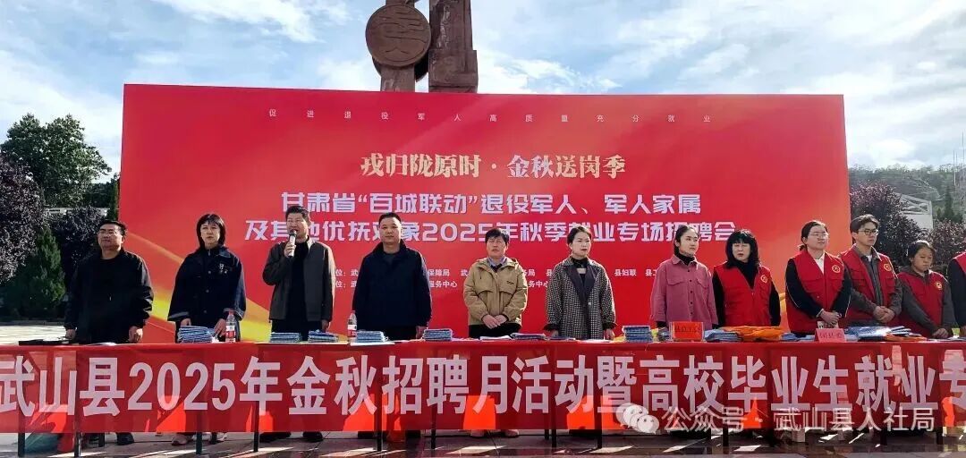 新天水讯 据武山县融媒体中心消息 为深入贯彻落实党中央、国务院关于稳就业保民生的决策部署,积极应对高校毕业生就业高峰期。近日,武山县人社局联合县退役军人事务局、县总工会、团县委、妇联、县工商联等单位在武山县火车站广场举办了“戎归陇原时·金秋送岗季——2025年金秋招聘月活动暨高校毕业生就业专场招聘会”,吸引了众多退役军人和未就业高校毕业生等重点群体前来参加。