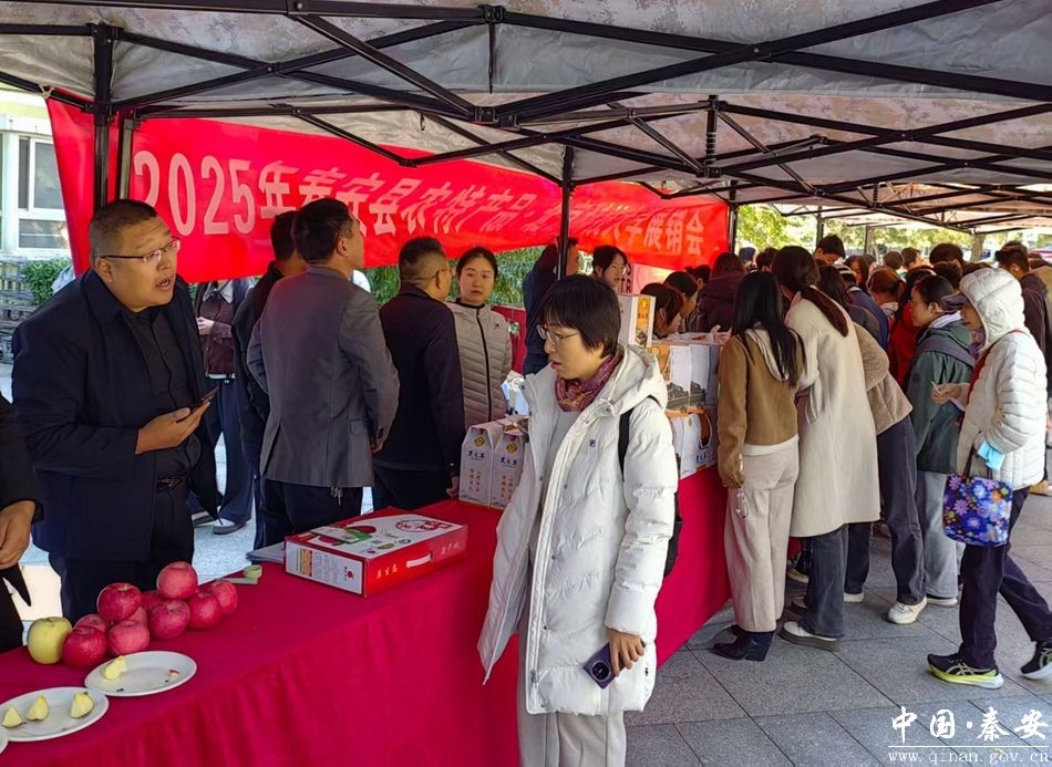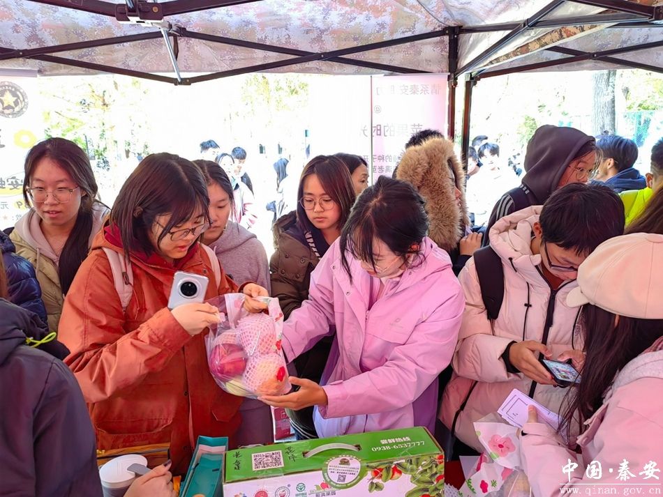 展销现场人头攒动,气氛热烈。来自秦安的各类特色农产品琳琅满目,整齐陈列,吸引了大量师生驻足品尝和选购。