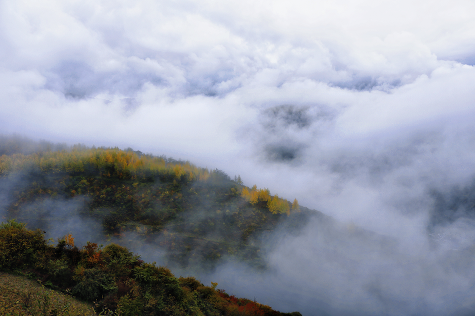 极目远眺,两岸群山层林尽染。秋风这位技艺超凡的画师,将枫叶点成炽烈的红,将白杨镀成明亮的黄,依旧坚守的松柏则沉淀为厚重的墨绿。这斑斓的色彩在缭绕的烟岚中若隐若现,朦胧而诗意,仿佛仙境遗落人间。