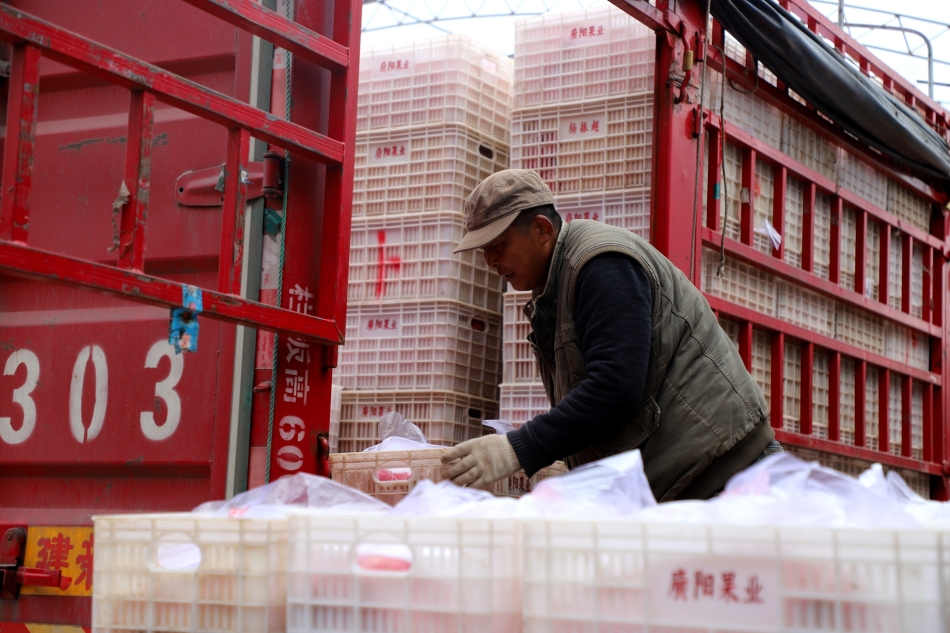 在远门镇单魏村广场,几辆红色大卡车整齐停放,村民两人一组,将装满苹果的塑料筐稳稳递到车厢内,收购商一边清点数量,一边与村民核对重量,称重声、搬运声、谈笑声交织在一起,构成了一幅热闹的丰收画卷。