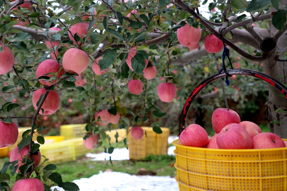 果园里,像李元科这样忙碌的村民还有不少。大家或穿梭在果树间采摘,或将装满苹果的筐子搬运到地头,欢声笑语在果园里回荡。