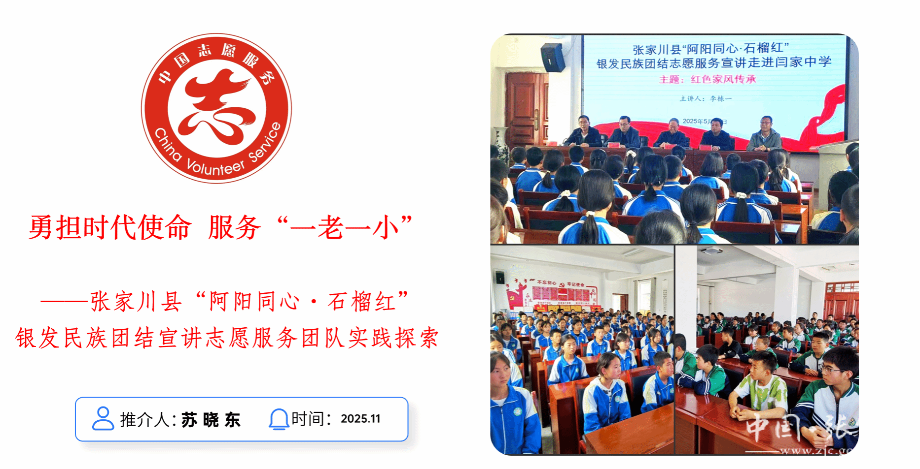 张家川县精心打造“阿阳同心·石榴红”银发民族团结宣讲志愿服务项目,组织老干部、老党员等“五老”人员组成百人宣讲团,深入学校、社区开展主题宣讲与志愿服务,累计举办《传承红色基因》《立家德正家风》等主题宣讲38场、志愿服务活动62场,有效引导各族青少年增强爱国情怀与民族团结意识。项目坚持“三聚焦”“三结合”,将民族团结教育、美德教育与关爱帮扶深度融合,通过“党建带团建”“老少齐共建”等形式,构建起“一老一少”服务保障体系,推动民族团结理念深入人心。目前,该项目已成为张家川县关心下一代和银龄志愿服务的亮丽名片,为民族地区基层治理与转型升级贡献了“银发力量”与文明实践经验。