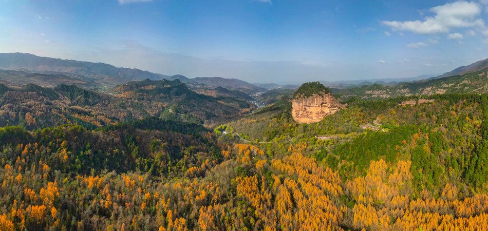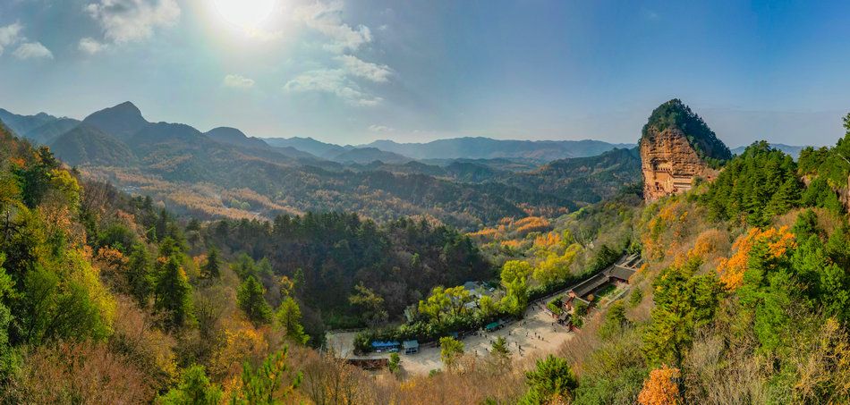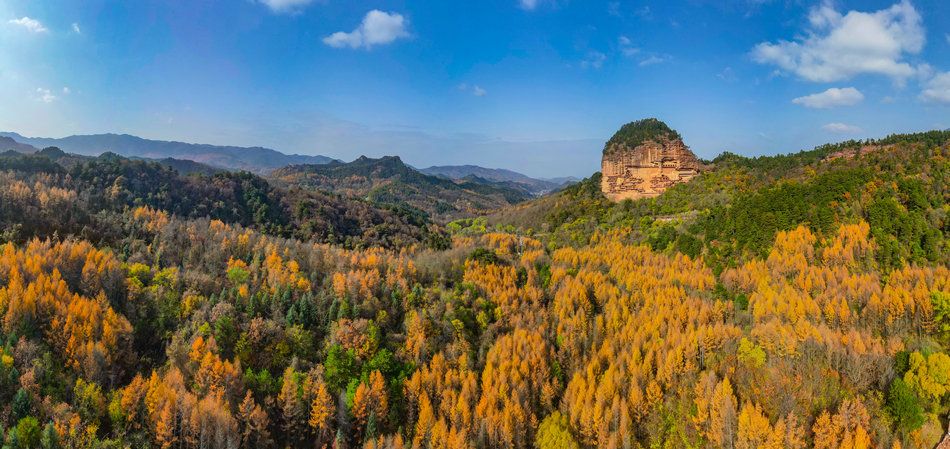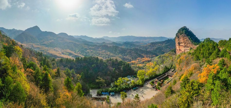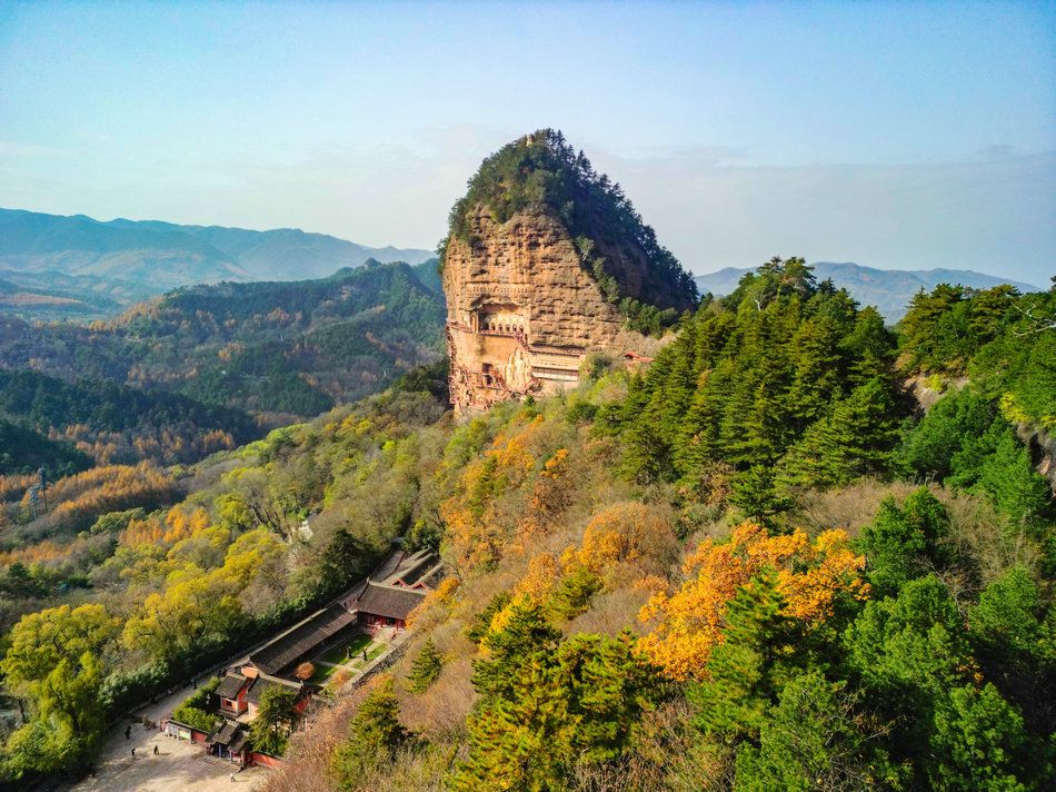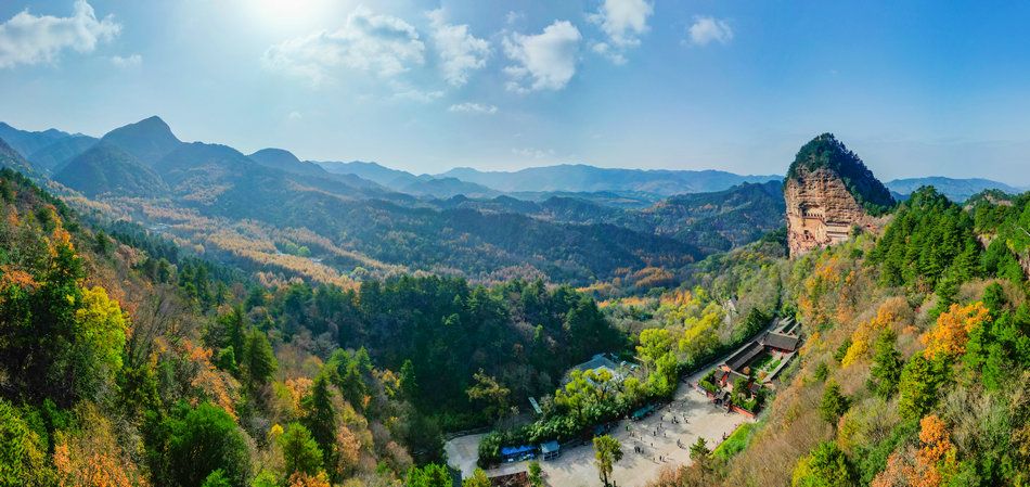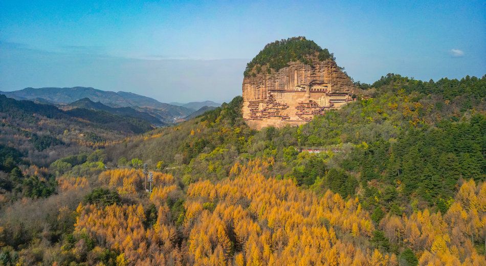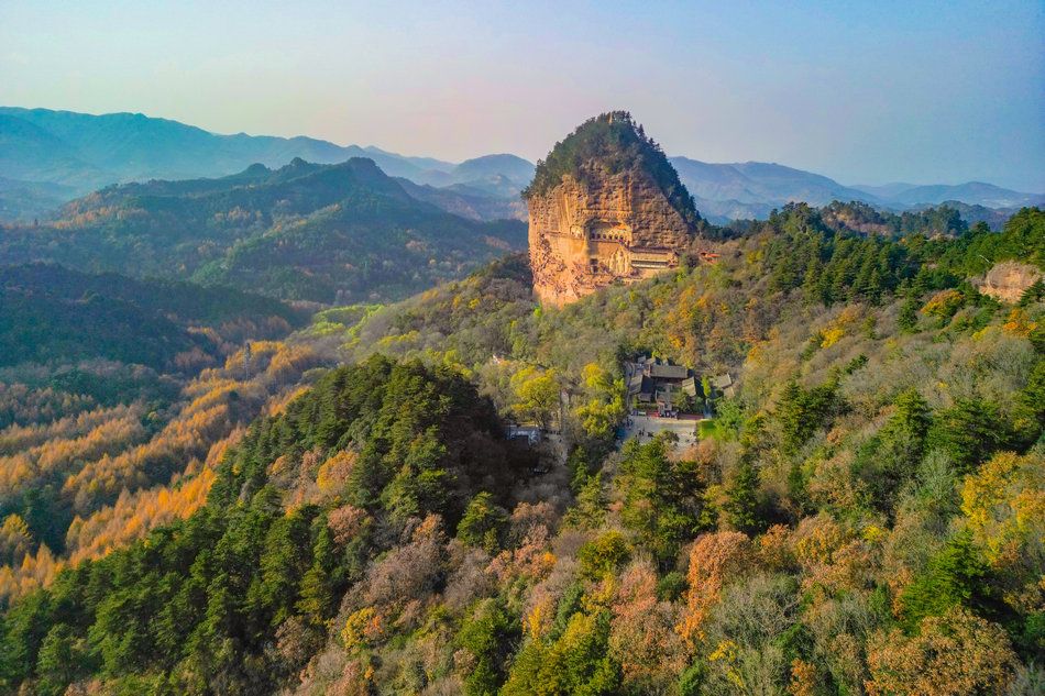 新天水讯 据麦积区融媒体中心消息 初冬时节,麦积山在暖阳映照下展现迷人景致。丹霞孤峰矗立,崖壁佛龛古朴。随着季节流转,原本蓊郁的山色化为黄、橙、红交织的锦绣画卷,为巍峨群山披上斑斓霓裳。远望山色空濛,古寺在彩林间若隐若现,整个佛国胜境在初冬的清寒中更显空灵壮美。