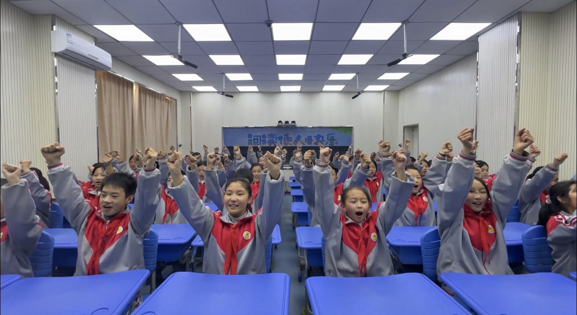 在教室里,另一番热闹景象正在上演。部分班级学生们端坐课桌前,伴随着节奏感十足的音乐跳起课桌舞。拍手、跺脚、转身,动作与音乐完美契合,既不占用额外场地,又能让学生充分活动身体。“大课间活动是学生们释放活力的黄金时间,不仅能锻炼他们的体能,还能培养团队协作意识,让孩子们在运动中学会配合、懂得坚持。”学校音乐教师刘艳婷介绍,学校将音乐元素深度融入大课间,通过精心编排健身操、课桌舞等特色活动,“既能让孩子们在轻松的氛围中放松身心,缓解学习压力,又能让他们在运动中感受音乐的魅力,潜移默化地进行美育和德育教育,让大课间成为‘运动+艺术’的双重成长平台。”