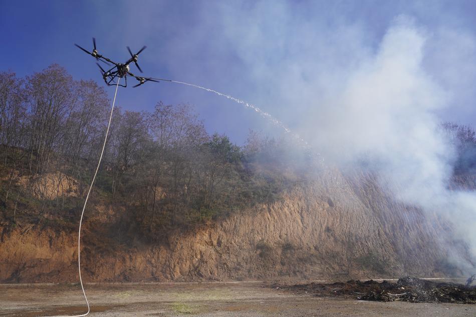 演练中,新型灭火装备的应用成为亮点。单系留高空灭火无人机实现稳定悬停,FC100运载无人机精准投掷干粉灭火弹,展现出高科技装备在复杂火场中的高效与安全优势。现场指挥员表示:“新型装备为灭火救援提供了新思路。无人机能够突破地形限制,直达火场上空,实施精准灭火。”