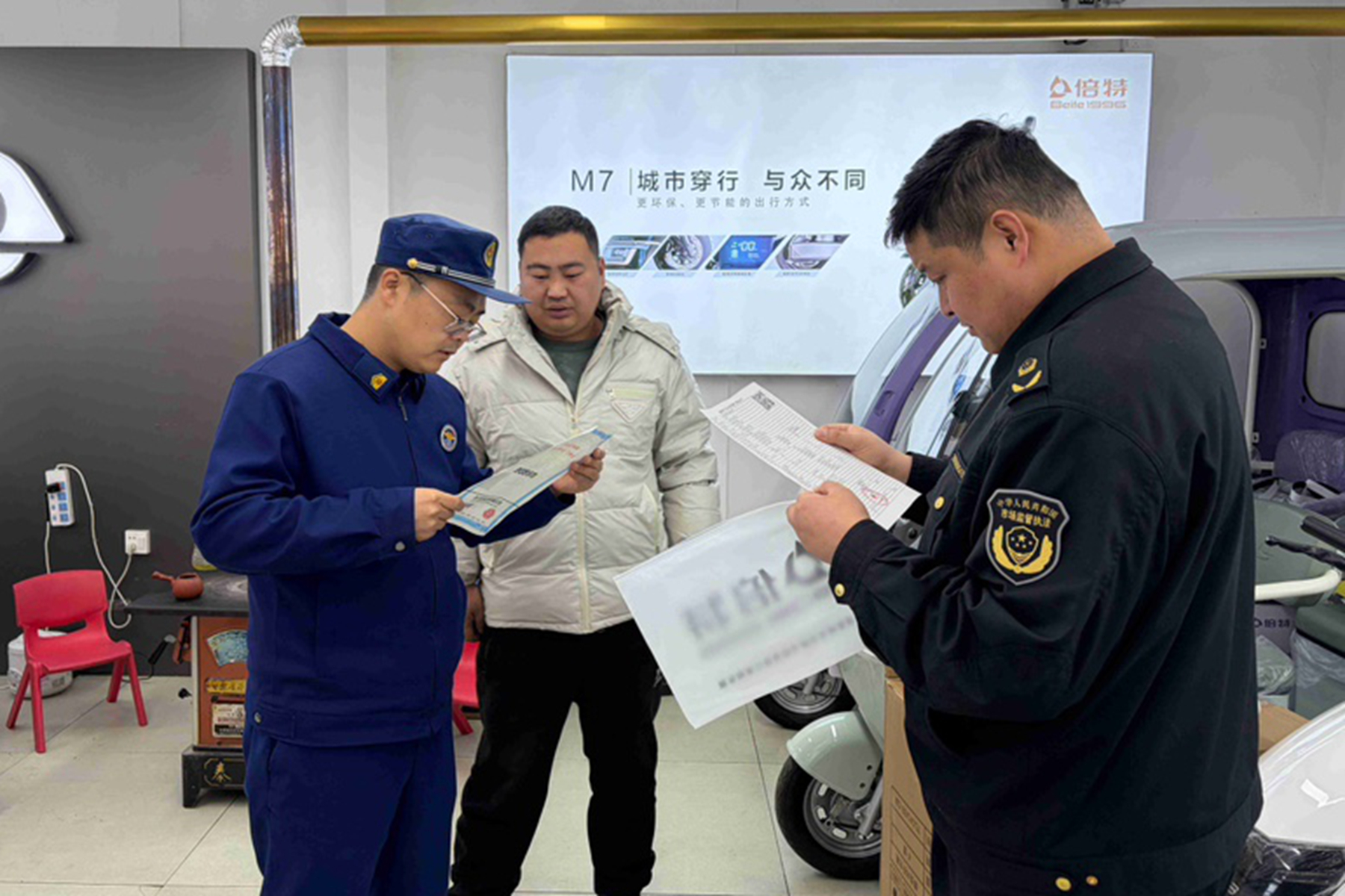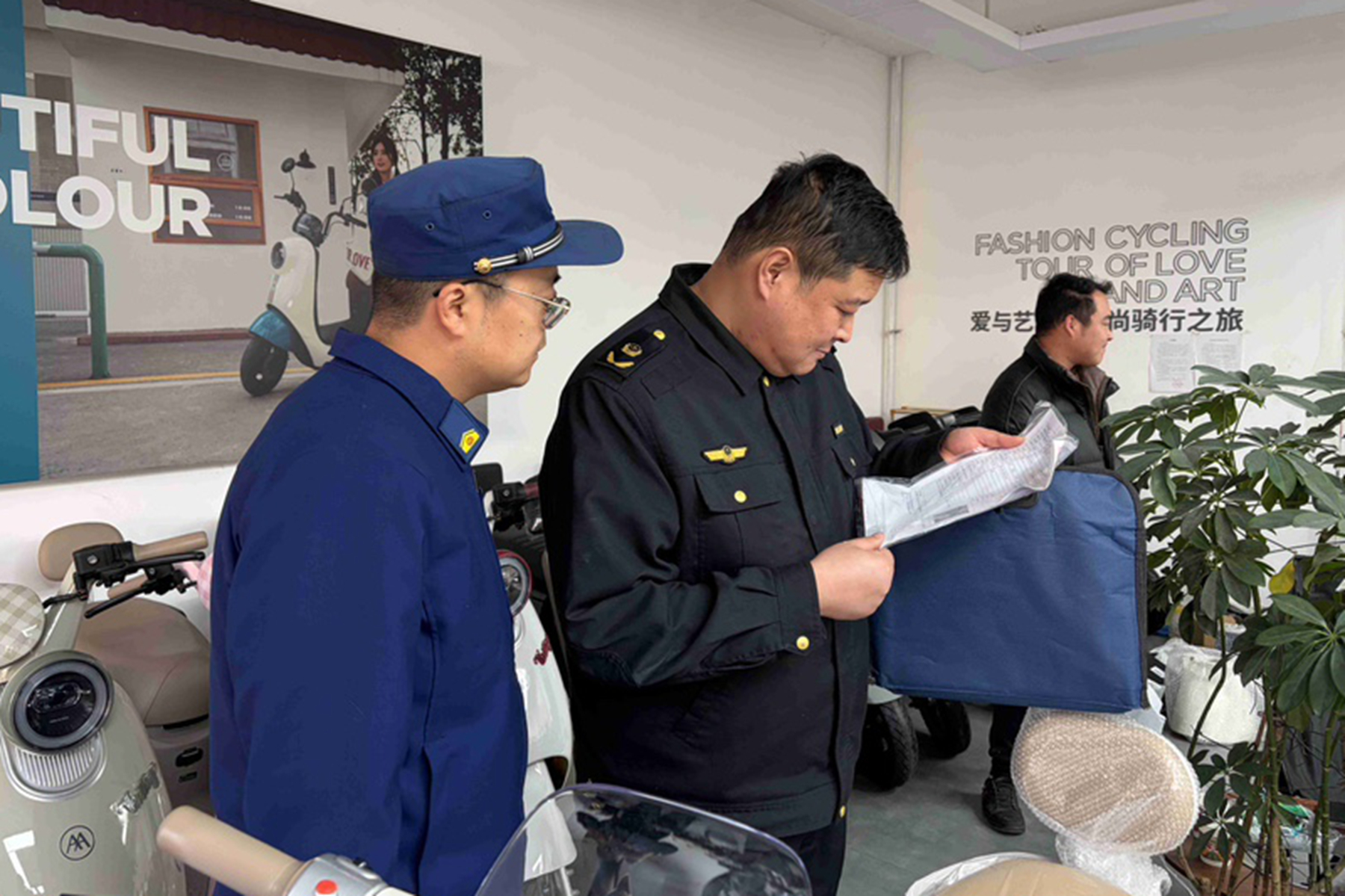 专项检查组先后深入电动自行车专卖店、品牌销售点、维修店等地,通过查阅资料、现场检查、询问负责人等方式,重点检查经营者是否依法取得营业执照,是否存在超范围经营行为,在售电动自行车是否获得强制性产品认证(CCC认证),产品标识、标牌是否清晰规范,标注信息(如生产厂家、型号、执行标准、电池类型等)是否与认证证书一致。督促经营者严格落实进货检查验收制度,建立完整的进货台账,确保产品来源可溯、质量合格。