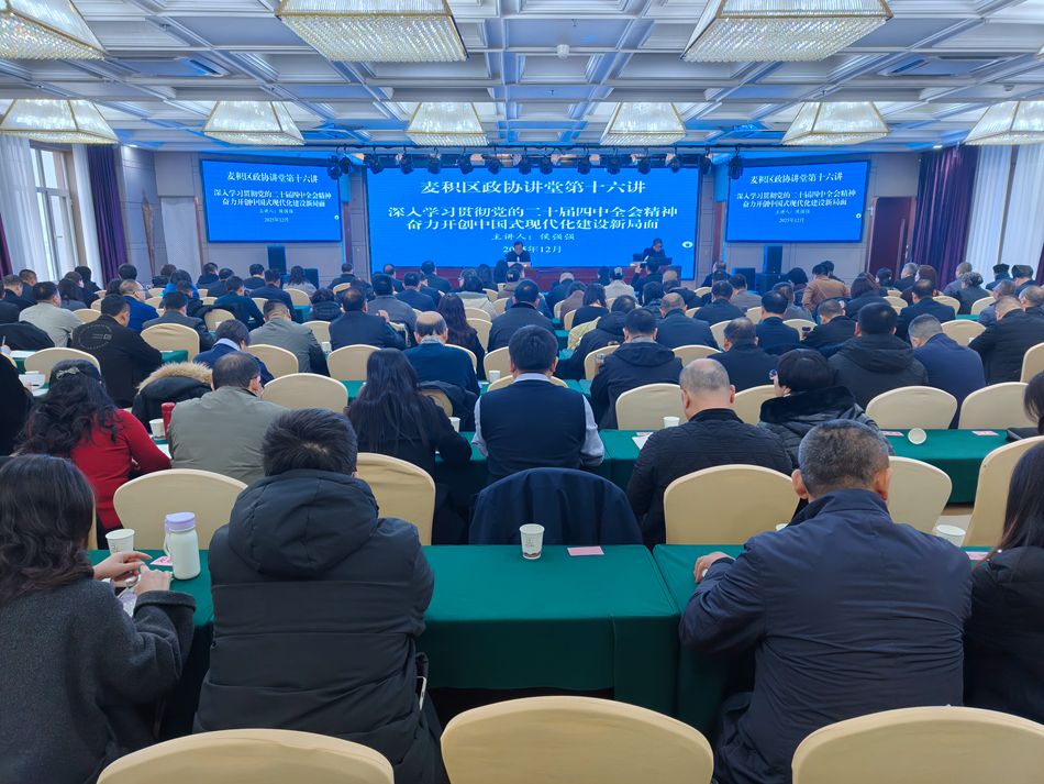 新天水讯 据麦积区融媒体中心消息 为全面深入学习宣传贯彻党的二十届四中全会精神,12月10日,麦积区举办“政协讲堂”第十六讲。区政协党组书记、主席高志强主持讲座并讲话,区政协副主席兰春梅、张建凤、雷晓勇、石根才,秘书长王旺红及区政协全体委员、机关干部职工聆听了讲座。