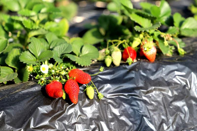紧邻油菜棚的草莓大棚内,浓郁的果香沁人心脾。红彤彤的草莓如同红宝石般镶嵌在翠绿叶片间,饱满多汁、色泽诱人,引得不少游客专门驱车前来体验采摘乐趣。“我们可是冬日里的‘甜蜜担当’,新鲜采摘的草莓甜中带香,一口下去全是阳光的味道!”一颗熟透的草莓仿佛在骄傲“自述”。