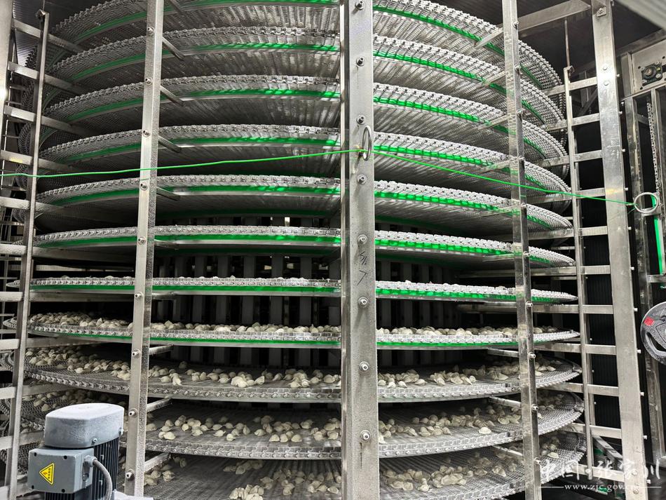 通过传送带,等待新鲜水饺的是一个巨大的魔法屋——隧道螺旋速冻机,这台机器能将水饺瞬间锁鲜,让红花牛肉的鲜嫩和蔬菜的新鲜最大程度地保存下来,有效提高水饺品质。随后新鲜的恒香水饺被打包装箱进入冷库,等待冷链车的运输。