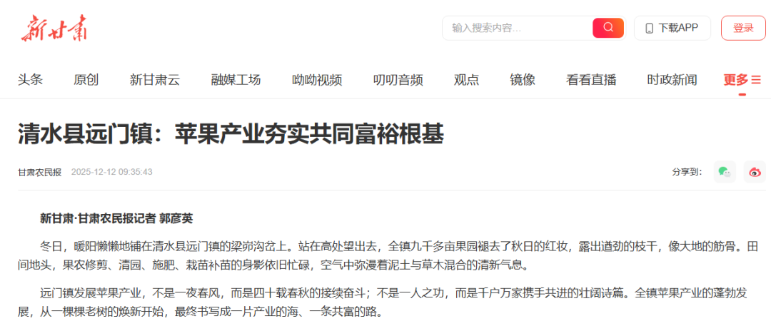 两位老人的“苹果人生”,恰是远门镇苹果产业最生动的注脚。从个人勤恳的奋斗,到“低质低效果园改造”政策的东风;从一家一户的酸甜生计,到支撑起乡村振兴的甜蜜产业——苹果,串联起的是个人的命运与时代的脉搏。它见证着老去,也孕育着新生;它承载着过往的艰辛,更寄托着未来的希望。