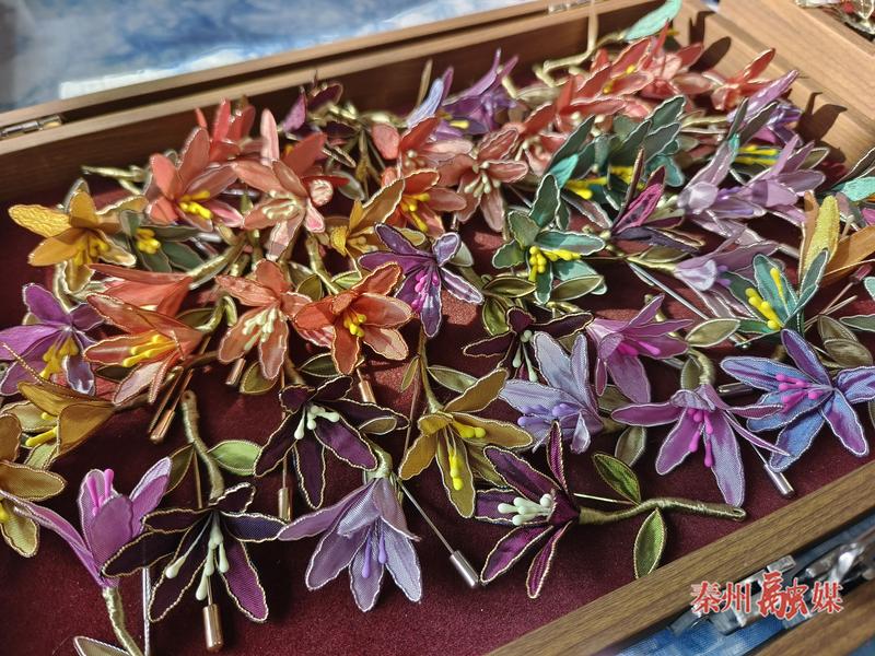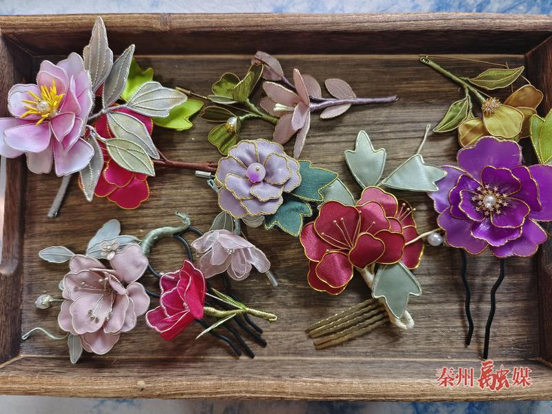 “这个是掐丝的工艺,我们用铜丝掐丝好以后粘在这个面料上,做成花瓣、树叶,最后组装成这种玫瑰花。我们女性都是非常爱美的,我们通过观察大自然的花朵,做出来非常漂亮的花,也展示了我们的非遗手艺。”市级非遗传承人于颖说。