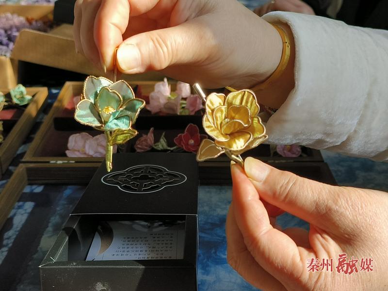 “我们今天是来交订单的,共做了上百个纯手工非遗掐丝胸花,前期通过区妇联牵头搭线,我们专门组织有这种手艺的人在农闲的时间一起完成订单,不仅可以贴补家用,而且足不出户就赚到了零花钱,也可以照顾家里,两不误。”秦州区太京镇北崖村妇联主任黄会萍说。