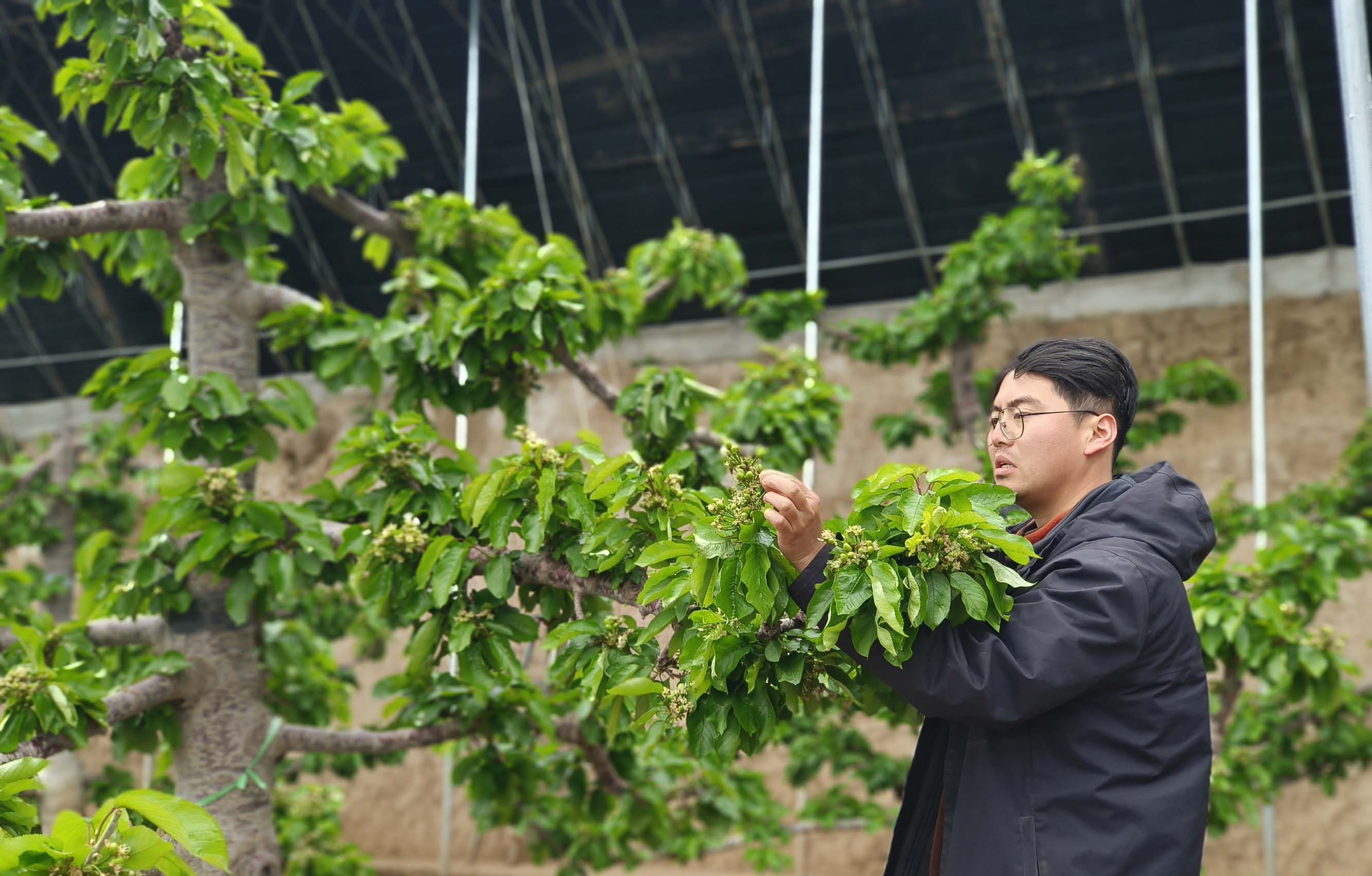 春节临近,秦州区玉泉镇烟铺村的设施大樱桃也将首批上市,通过精细化的“错峰种植”管理,这里的樱桃可实现从春节前到五月的梯次成熟、持续供应。在设施樱桃基地,不同大棚内景象各异:有的樱桃花簇满枝头,有的已结出黄豆大小的青果,更有大棚里红宝石般的樱桃即将成熟。基地利用“空调大棚”技术,在夏季进行为期68天的强制制冷,使樱桃树提前进入休眠,从而实现提早开花结果。