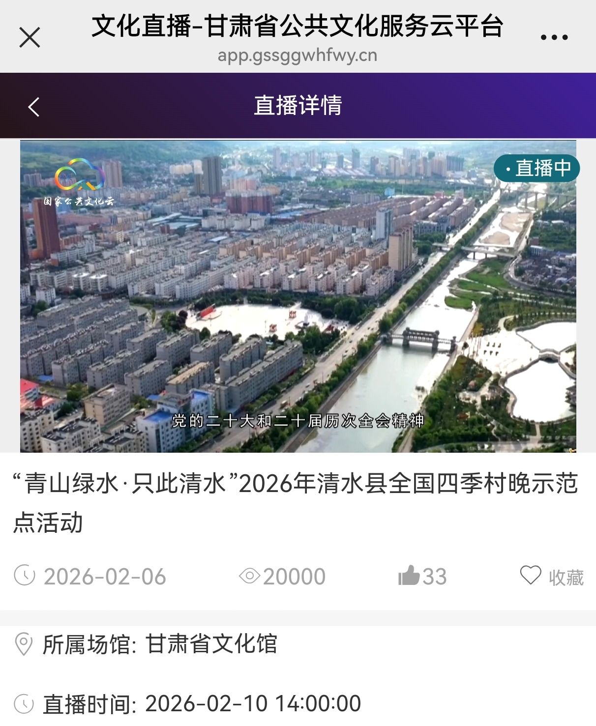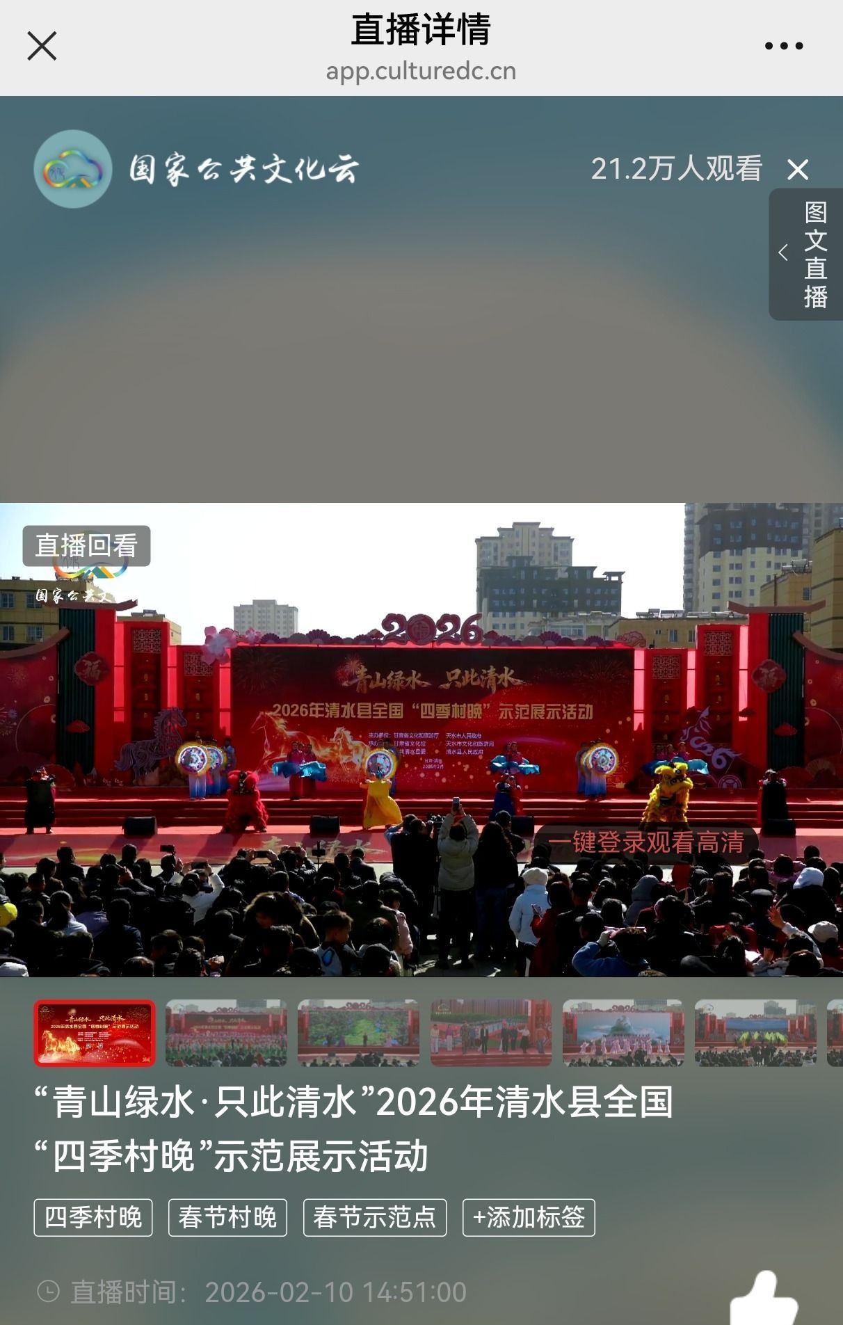 目前,2026年全国“四季村晚”清水县示范展示系列活动仍在持续,诚邀四海宾朋走进清水,赏花灯、购年货、泡温泉、品美食,在浓浓年味中感受轩辕故里热气腾腾的幸福生活,让云端流量转化为文旅活力。