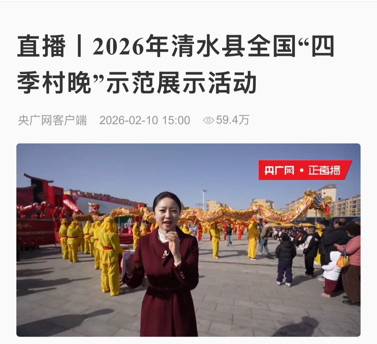 【过年来清水 五福带回家】人气爆棚!2026年全国“四季村晚”清水示范展示活动全网浏览量超878万人次