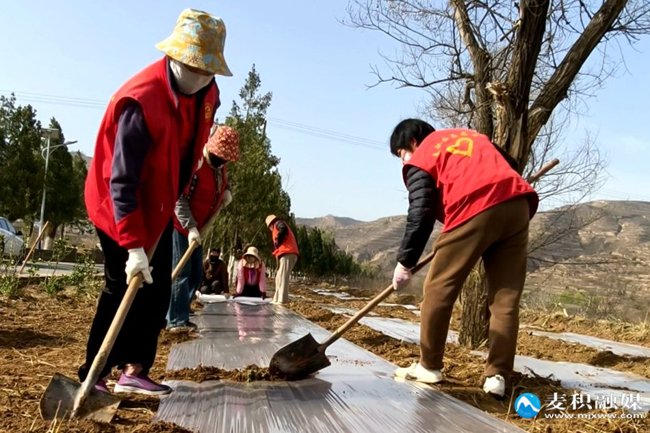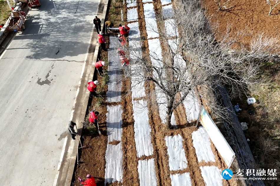 在镇村主干道、村道沿线,工作人员分工协作,清理杂草石块、规划栽植点位,有序开展覆膜作业。拉膜、压土、固定等环节连贯流畅,整齐的地膜覆盖田间,既起到保温保墒作用,也为红叶李、樱花、塔柏等苗木栽植做好了充分准备。