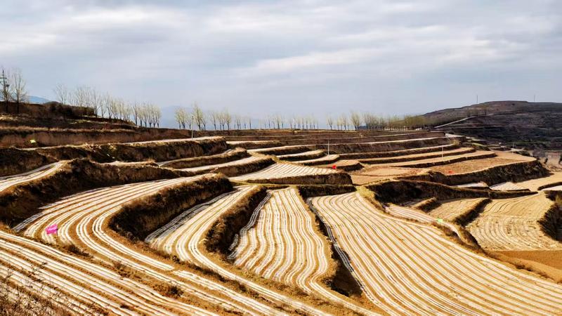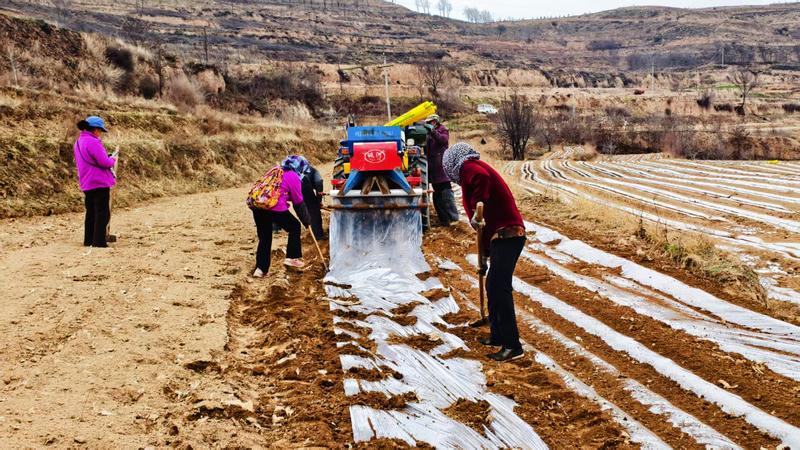西梁覆新膜,套种筑粮仓。山丹镇把大豆玉米带状复合种植铺膜作业作为春耕“第一仗”,组织干部群众抢抓墒情、覆膜保墒。西梁片区刘屲村人机协同作业,旋耕、铺膜、压边有序推进,白色地膜蜿蜒铺展在坡塬地块。同时,依托“党支部+合作社+农户”联农带农模式,以套种提升土地产出率,目前铺膜作业全面推进,为后续播种夯实保墒基础。