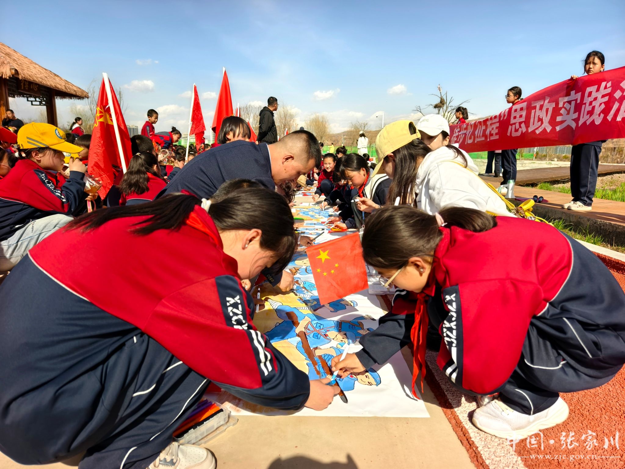 随后的手工实践环节,师生共同绘制长征主题画长卷。孩子们伏在画布上,用稚嫩的画笔勾勒出飞夺泸定桥、翻越夹金山等历史场景,鲜艳的党旗、红军的草鞋、胜利的会师……一笔一画间,红色基因悄然扎根心田。
