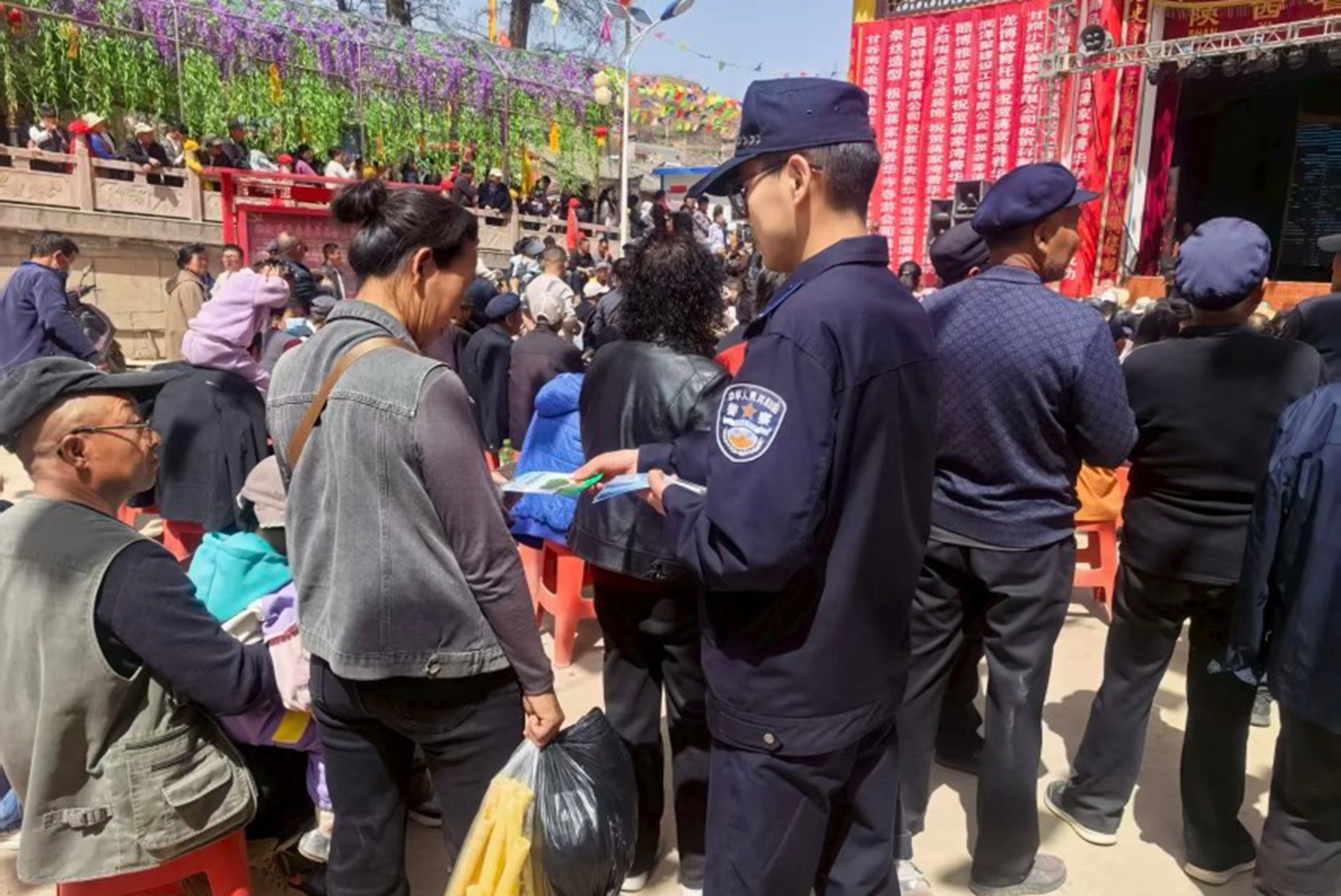 新天水讯 据甘谷县融媒体中心消息 4月4日,白家湾乡善华寺传统庙会热闹开场,甘谷县公安局白家湾派出所紧抓群众聚集的有利时机,在扎实做好庙会安保、维护现场秩序的同时,重点开展电信网络诈骗防范与禁毒专项宣传,切实提升群众安全防范意识,守护群众财产安全与身心健康。