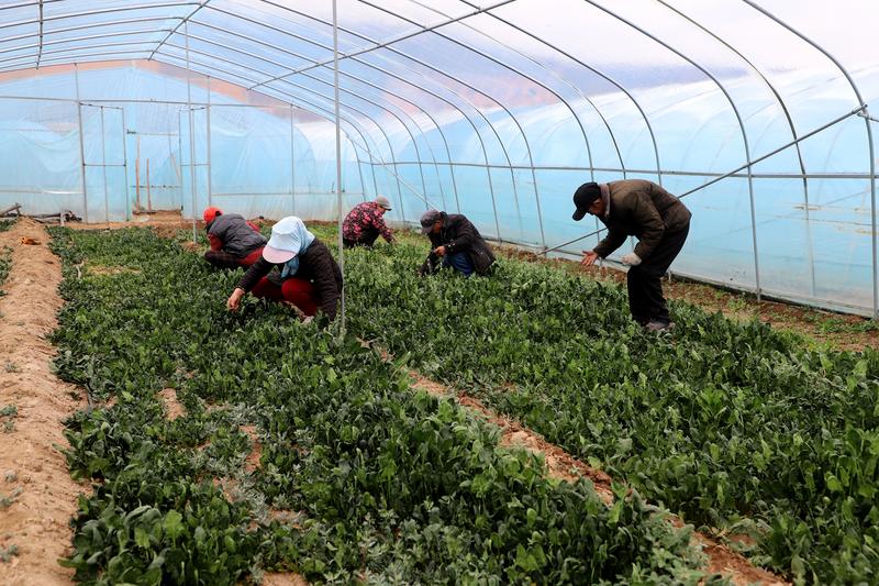 蔬菜大棚里同样春意盎然。在永清镇双场村标准化蔬菜基地,一排排大棚整齐连片,葱苗青翠挺拔、菠菜绿意满畦。基地通过“葱苗+西红柿”轮作模式,有效提升种植效益,保障蔬菜稳定供应。28座大棚规模化运营,常年吸纳本村及周边村民务工,从事播种、育苗、采收、分拣等工作,让村民在家门口稳就业、增收入,每座大棚收益1万元左右,实现了农户与村集体“双增收”。