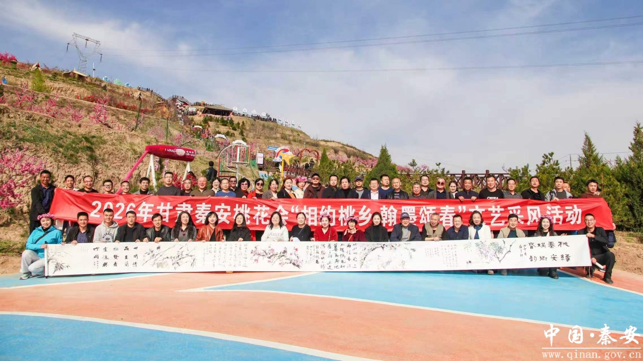 新天水讯 据秦安县融媒体中心消息 春风送暖,桃花盛放。4月8日下午,2026年甘肃秦安桃花会“相约桃乡·翰墨颂春”文艺采风活动在刘坪镇桃花堡顺利举行。市县文艺工作者齐聚桃园,以诗文、书画、摄影等形式,共赴一场春日里的文艺之约。