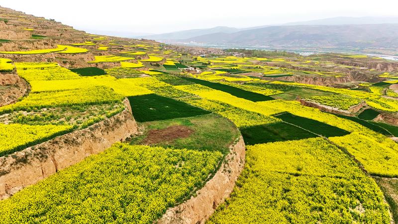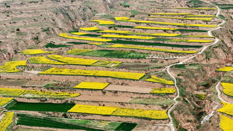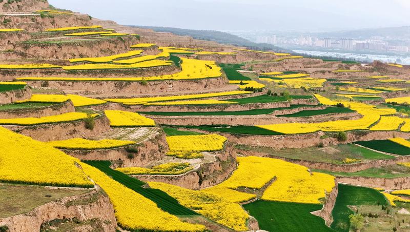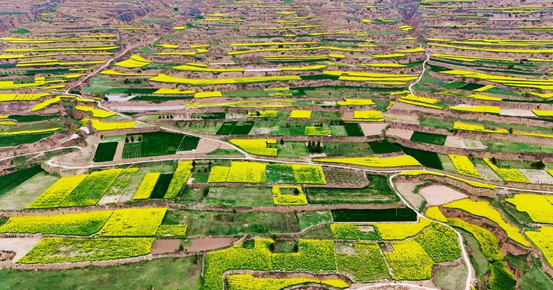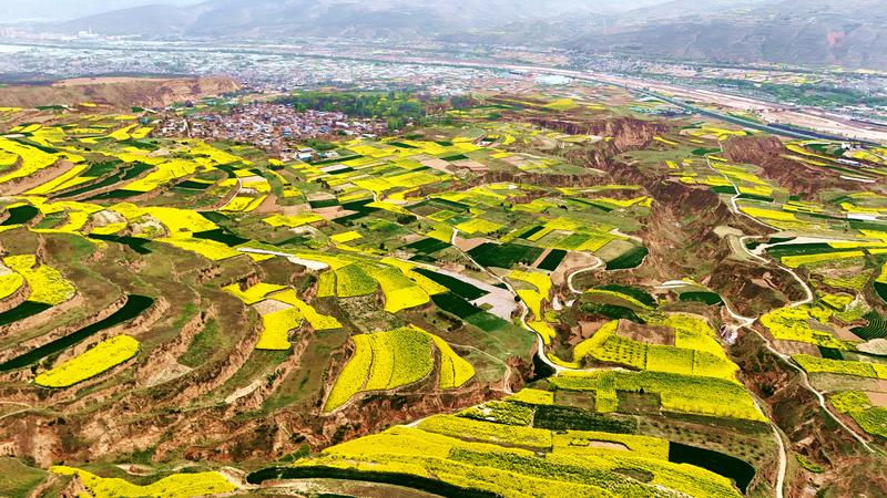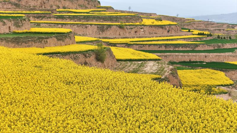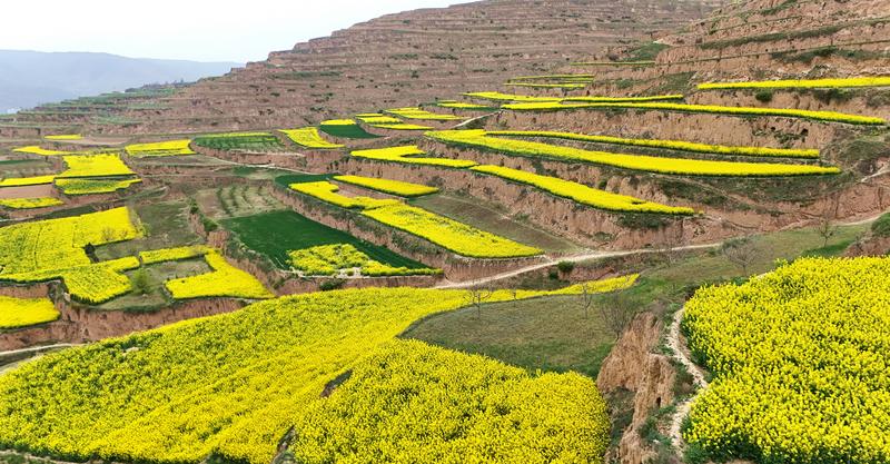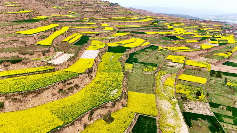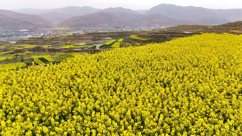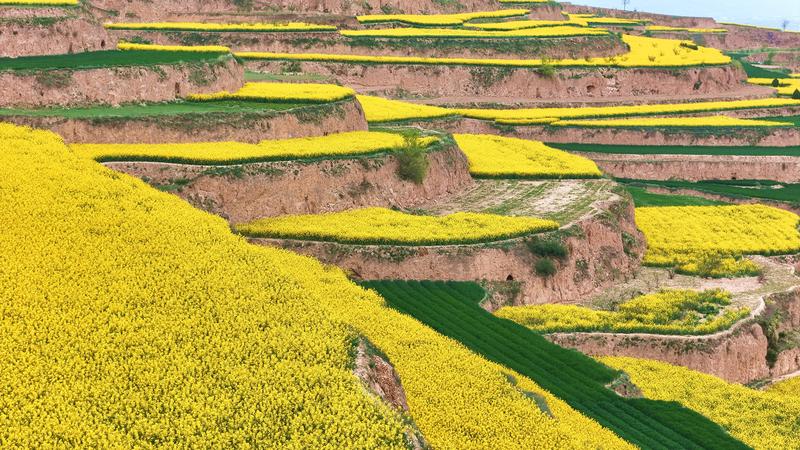 新天水讯 据武山县融媒体中心消息 春日武山,风光正好。在城关镇坪塬村的高山梯田上,油菜花正值盛花期,层层叠叠的金黄花海顺着山势蜿蜒舒展,与田间嫩绿的麦苗交错相映,勾勒出优美的大地肌理,如一幅色彩浓郁的春日油画,美不胜收。