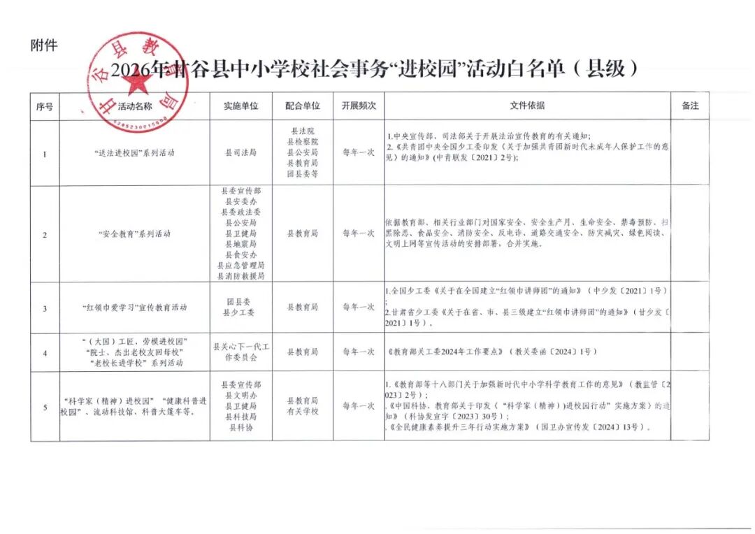 为持续推进整治形式主义为基层减负,切实减轻中小学教师非教育教学负担,根据中央教育工作领导小组秘书组关于开展规范社会事务进校园为中小学教师减负相关工作和《2026年甘肃省中小学校社会事务“进校园”活动白名单(省级)》要求,甘谷县教育局进一步修订完善相关内容,现面向社会予以公布。