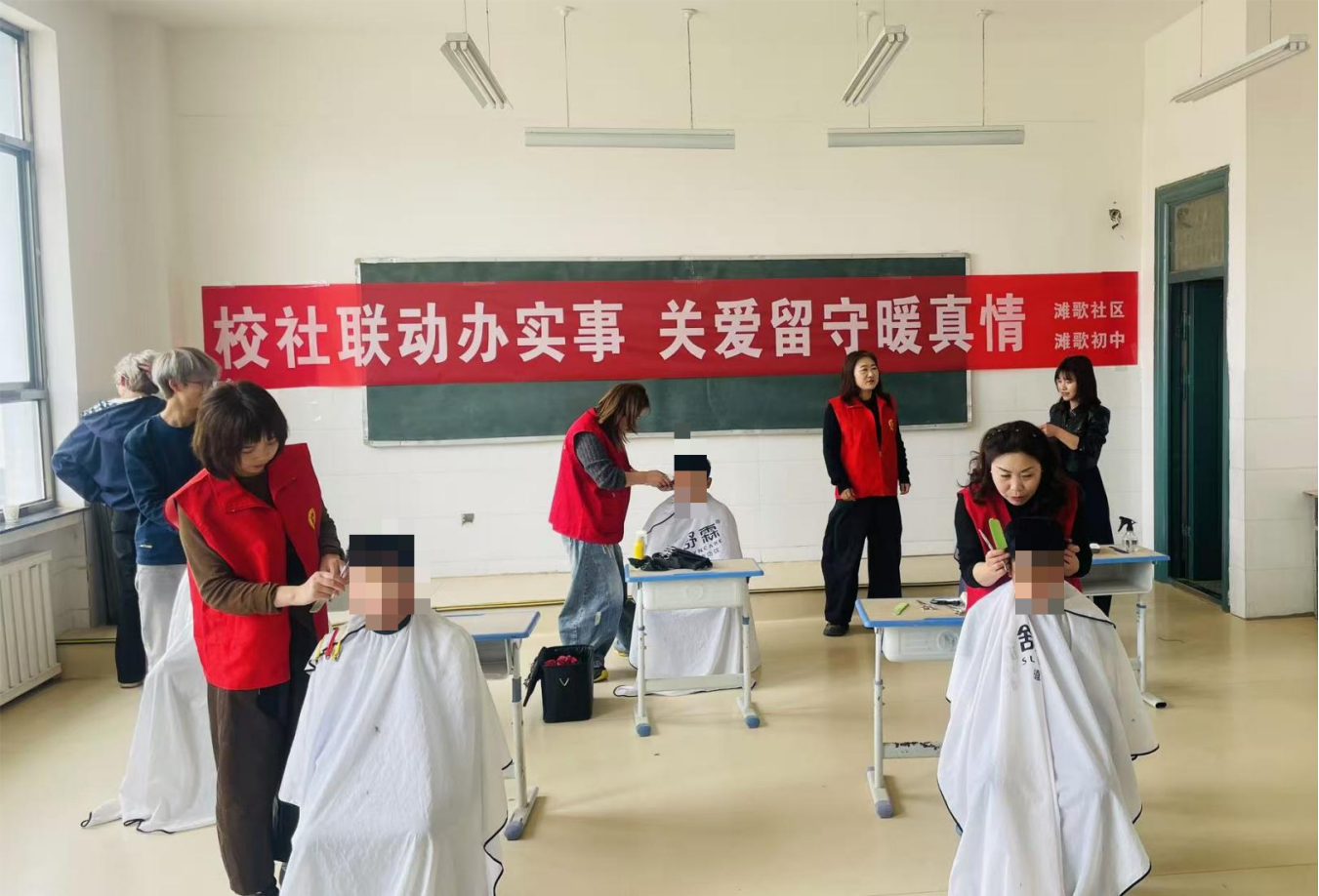 活动现场暖意融融,志愿者们以饱满的热情接待每一位前来理发的老人和孩子,耐心询问他们的发型需求,并在专业理发师的现场指导下,小心翼翼地进行梳理、修剪。服务过程中,志愿者一边娴熟地操作,一边陪老人们唠家常、询问身体状况,陪儿童聊天解闷、分享校园趣事,让原本枯燥的理发过程变得温馨又热闹。