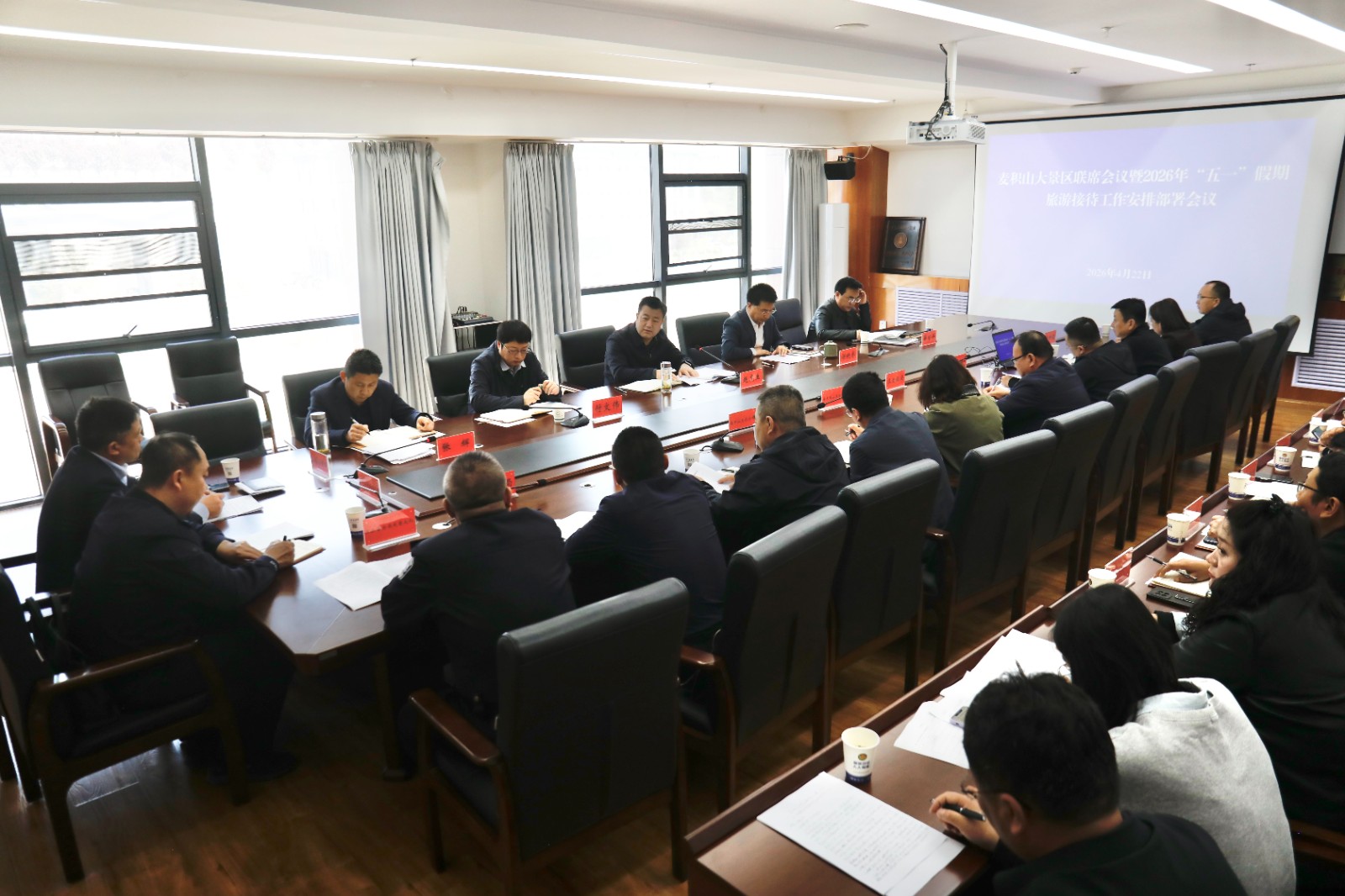 新天水讯 据麦积区融媒体中心消息 4月22日,麦积山大景区2026年“五一”假期旅游服务保障联席会议召开,麦积区委书记、麦积山大景区党工委书记赵虎生出席会议并讲话。会议听取“五一”假期旅游服务保障筹备情况汇报,安排部署“五一”假期旅游服务保障工作。麦积山大景区管委会主任谢晓睿主持会议,联席会成员单位负责人参加会议。