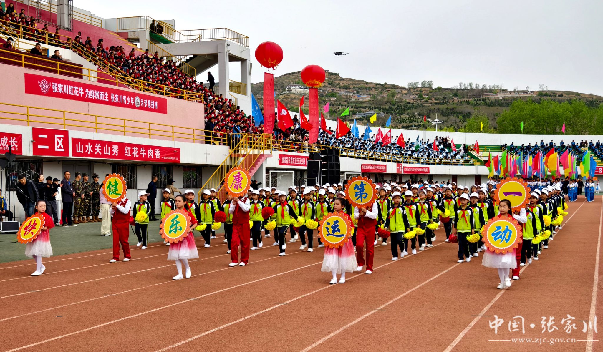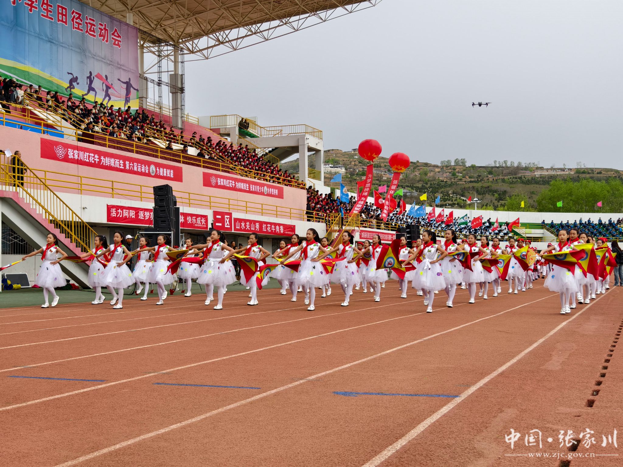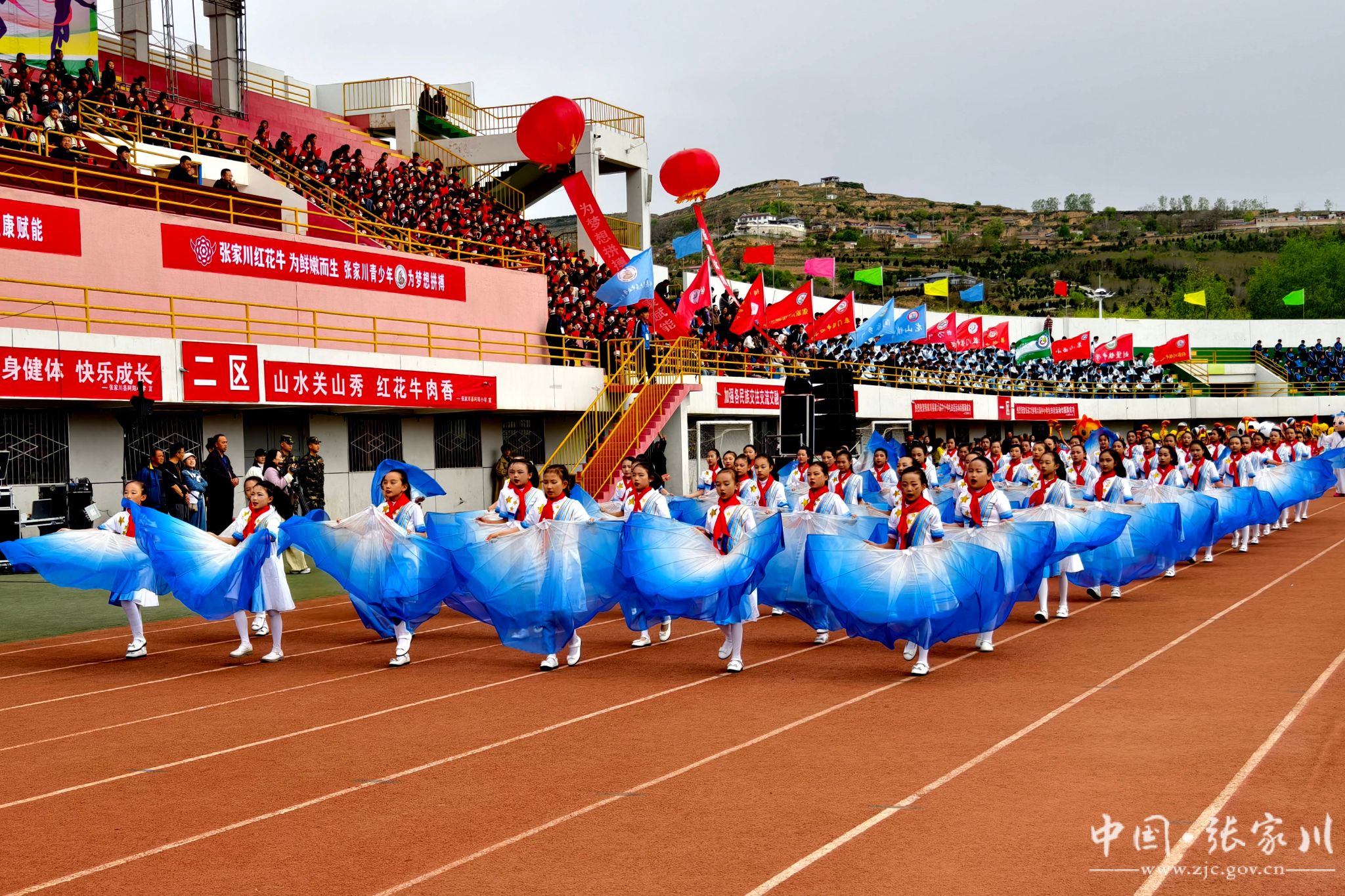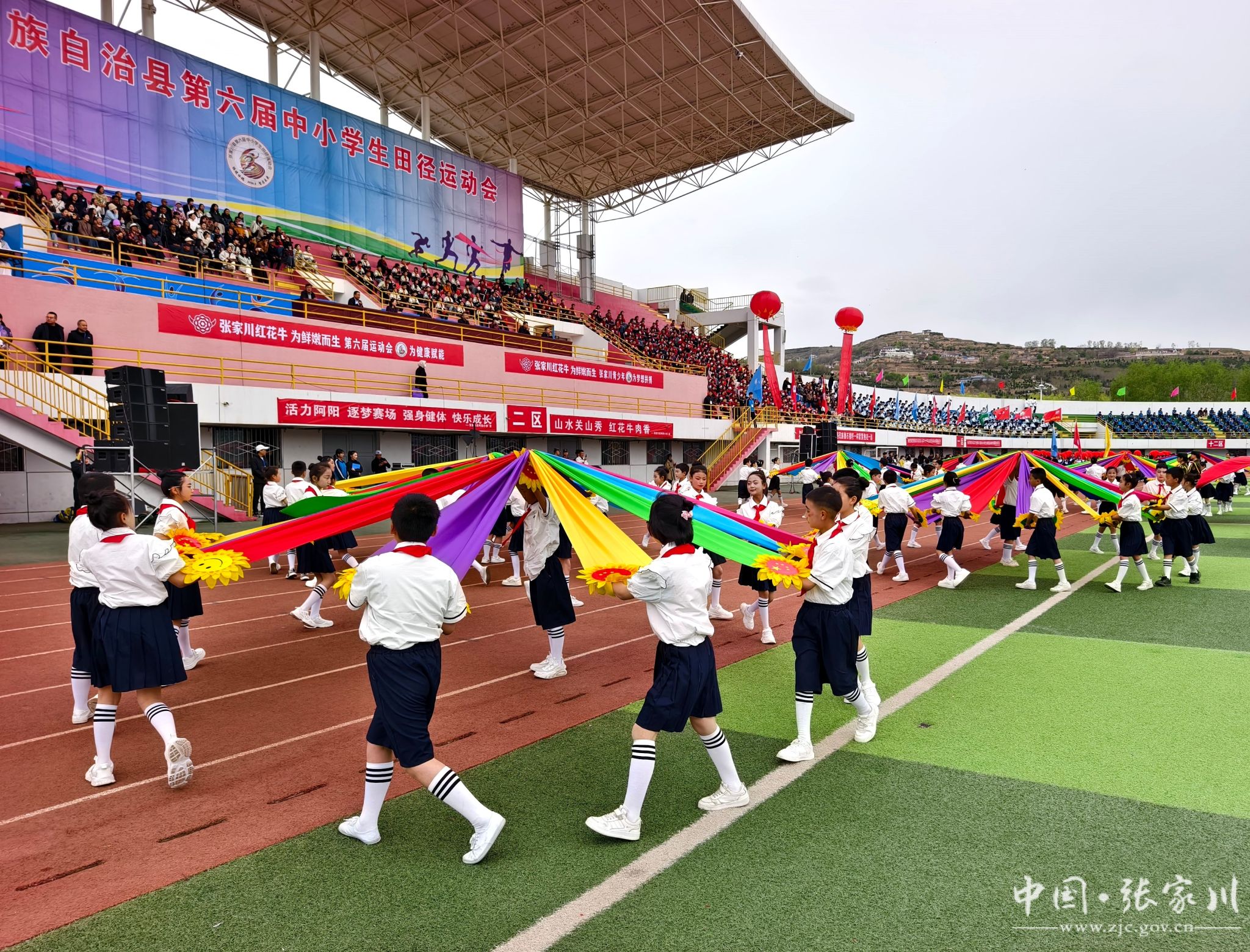 入场完毕,全场起立,在庄严的国歌声中,五星红旗冉冉升起,迎风飘扬。随后,大型文体表演轮番登场,近2000名学生用活力与热情点燃全场。新建小学带来《春润关山,红花向阳开》,红扇翻飞间摆出可爱红花牛造型,将乡土情怀与童真童趣完美融合;张川镇中学献上《我的祖国》,千名学子舞动红绸、变换队形,勾勒锦绣山河,唱响“强国有我”的青春誓言,家国情怀与体育精神交相辉映,将开幕式氛围推向高潮。