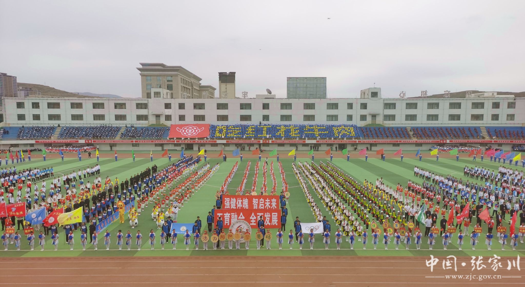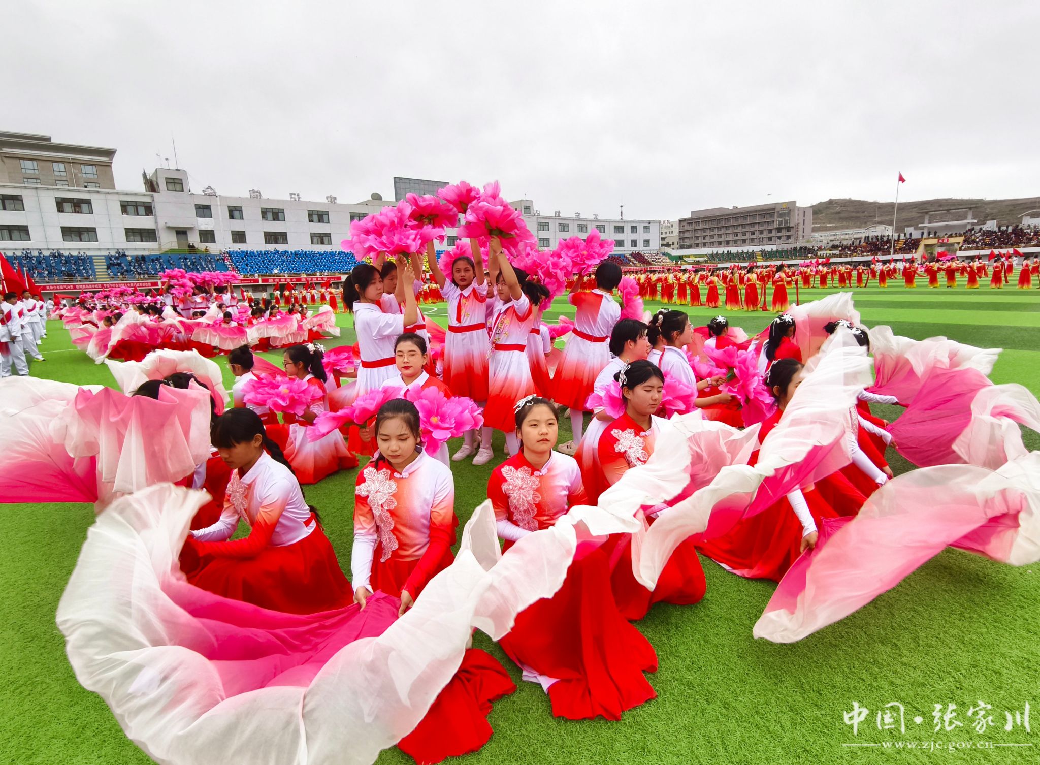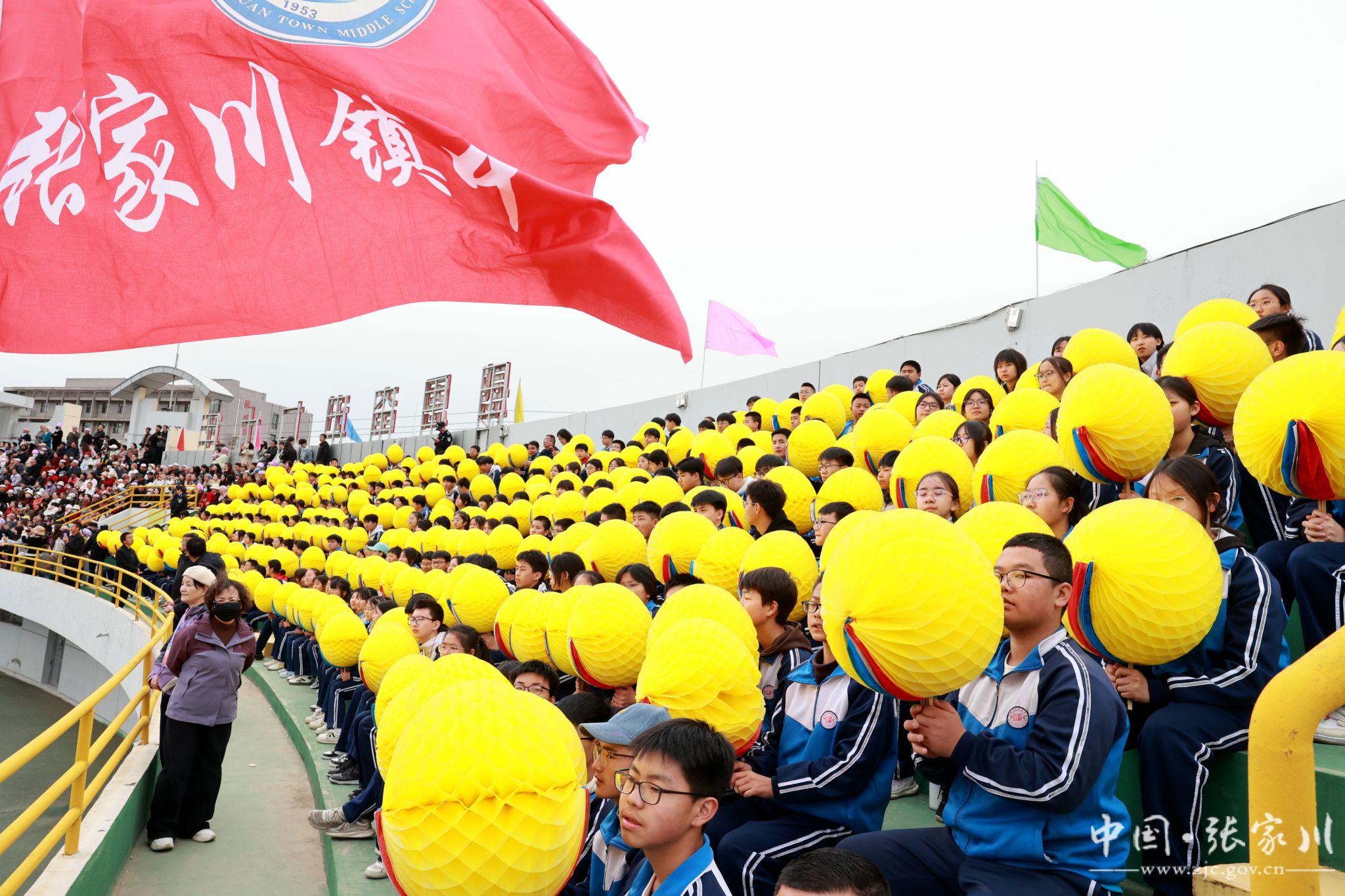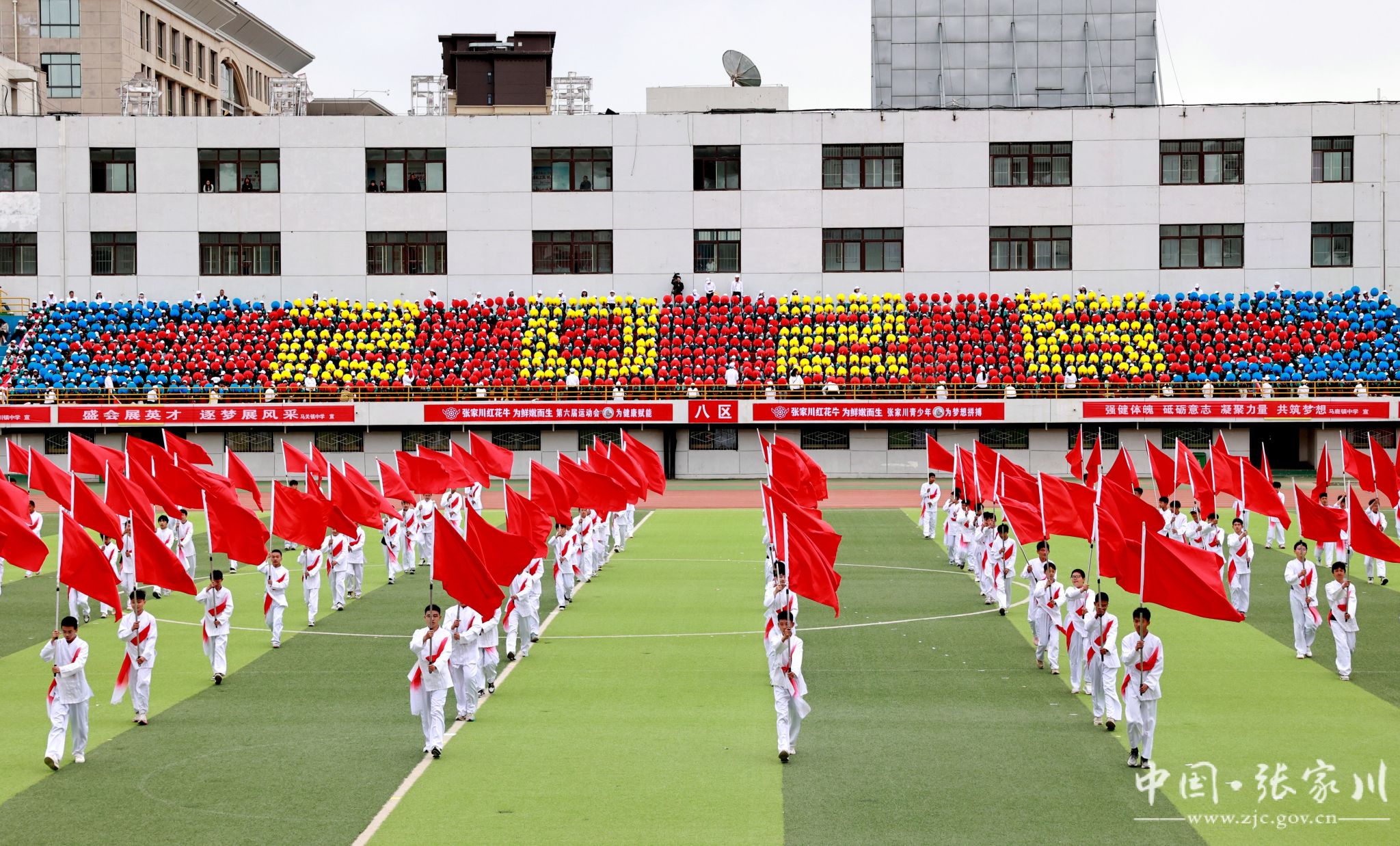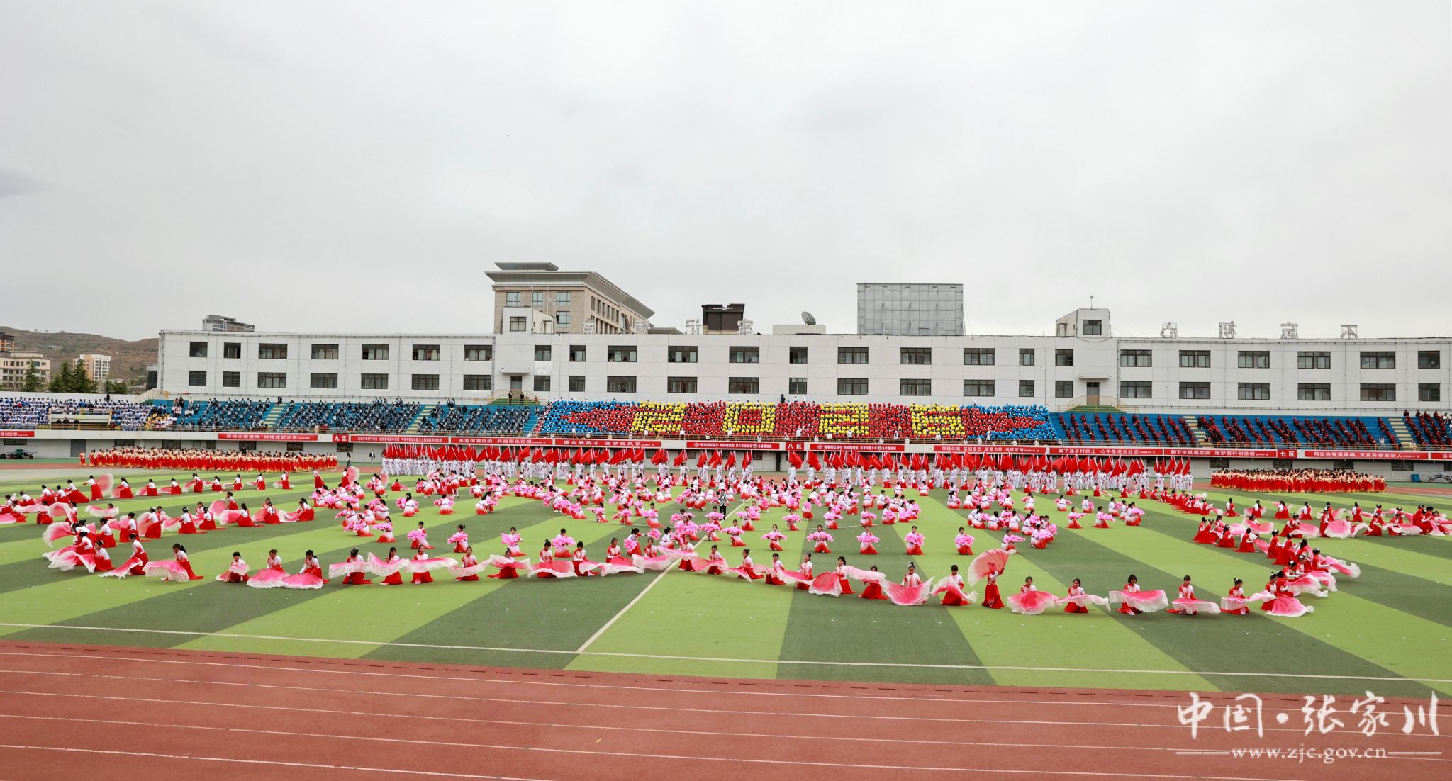 入场完毕,全场起立,在庄严的国歌声中,五星红旗冉冉升起,迎风飘扬。随后,大型文体表演轮番登场,近2000名学生用活力与热情点燃全场。新建小学带来《春润关山,红花向阳开》,红扇翻飞间摆出可爱红花牛造型,将乡土情怀与童真童趣完美融合;张川镇中学献上《我的祖国》,千名学子舞动红绸、变换队形,勾勒锦绣山河,唱响“强国有我”的青春誓言,家国情怀与体育精神交相辉映,将开幕式氛围推向高潮。
