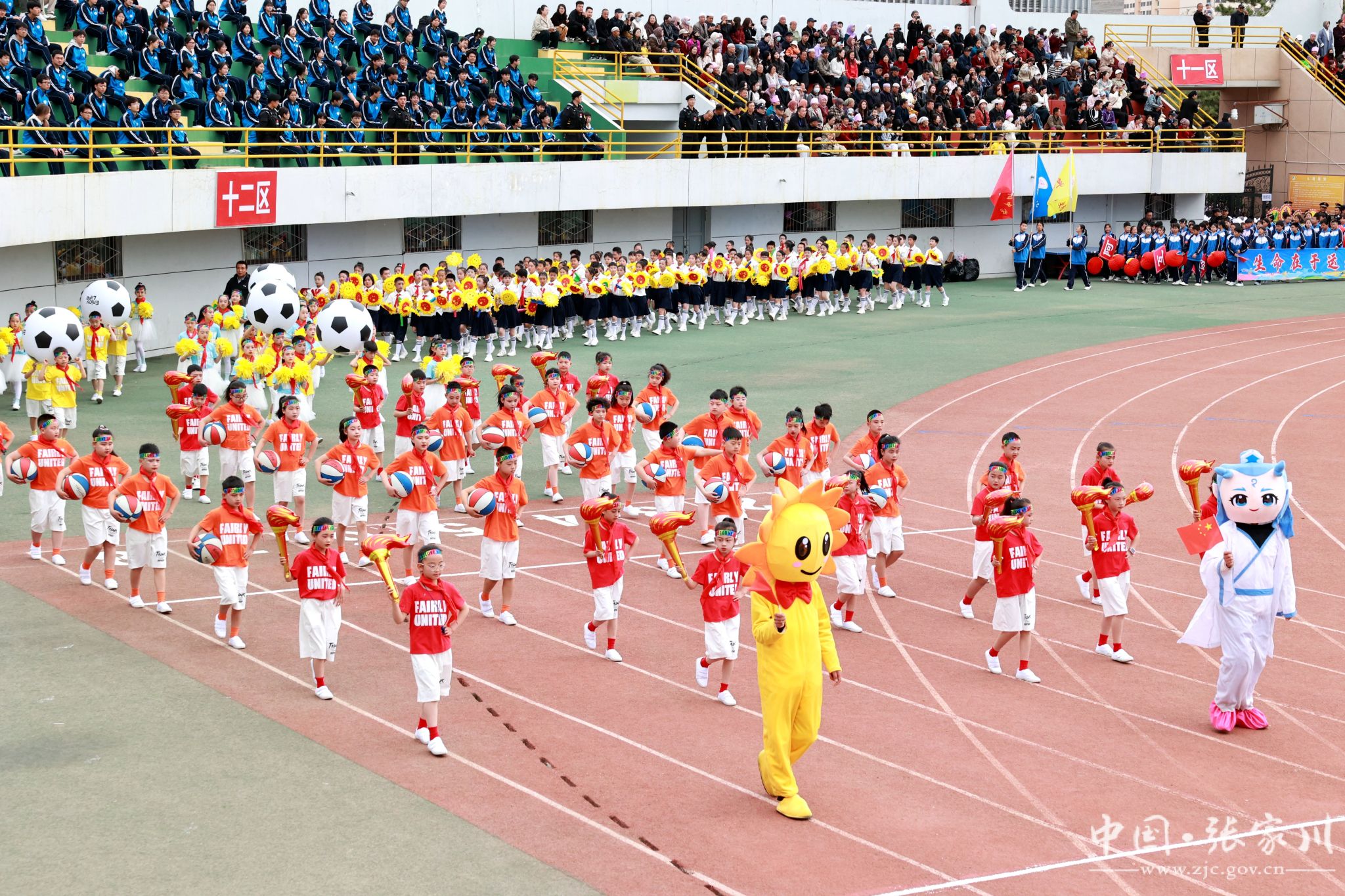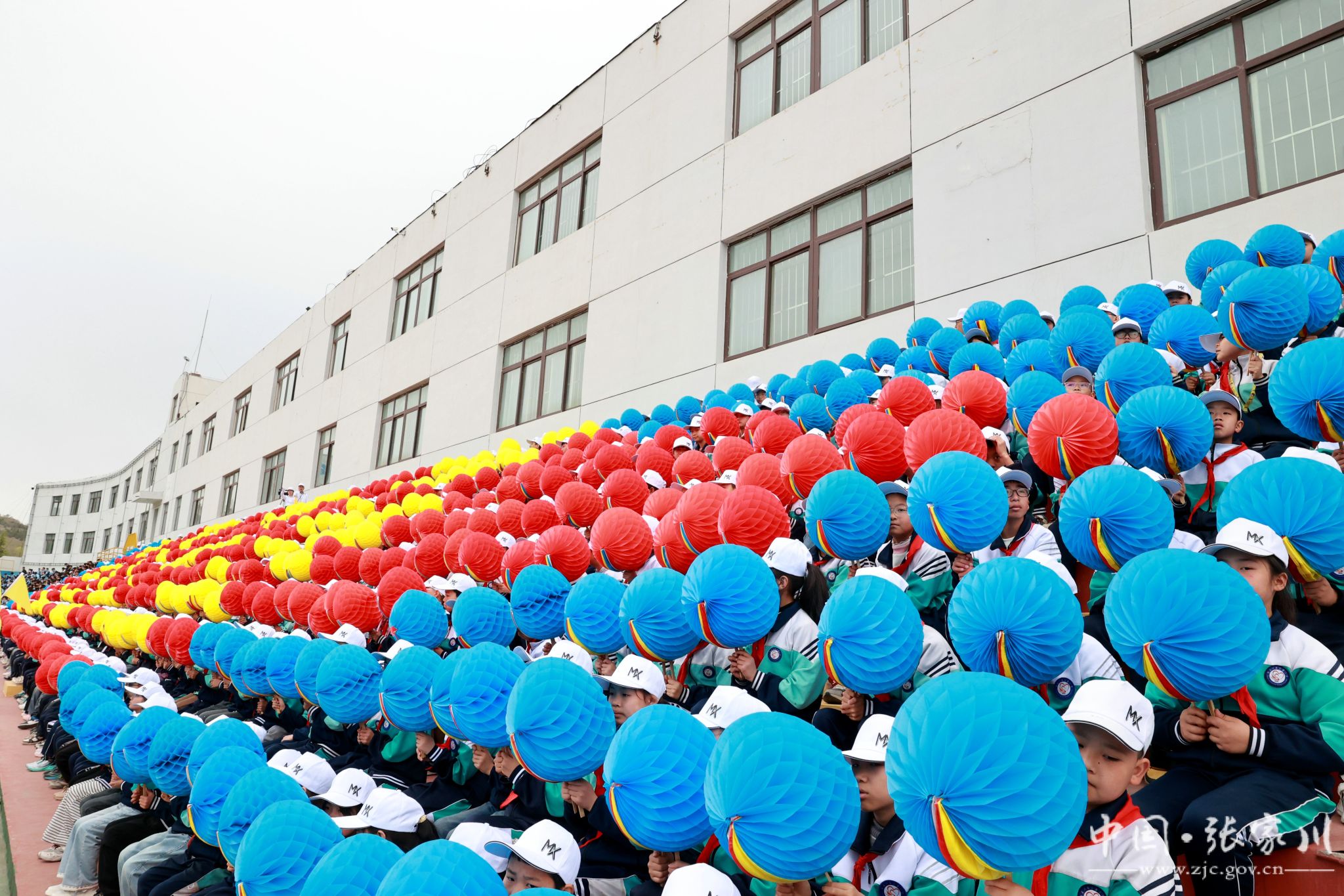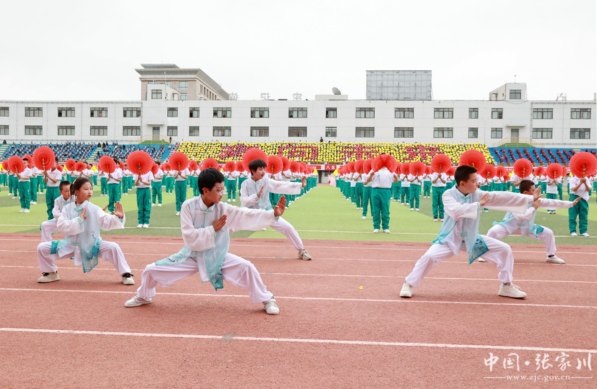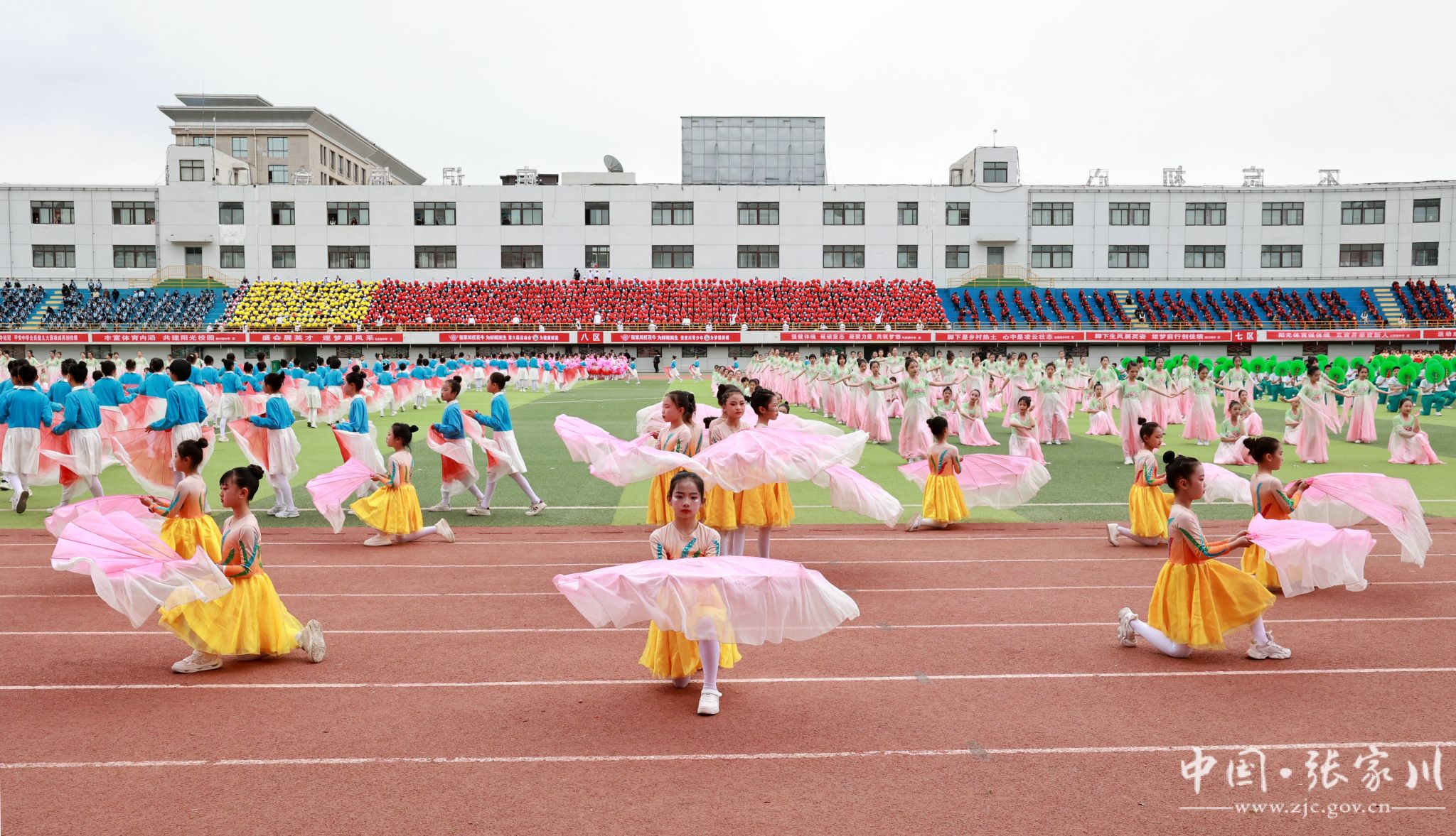 入场完毕,全场起立,在庄严的国歌声中,五星红旗冉冉升起,迎风飘扬。随后,大型文体表演轮番登场,近2000名学生用活力与热情点燃全场。新建小学带来《春润关山,红花向阳开》,红扇翻飞间摆出可爱红花牛造型,将乡土情怀与童真童趣完美融合;张川镇中学献上《我的祖国》,千名学子舞动红绸、变换队形,勾勒锦绣山河,唱响“强国有我”的青春誓言,家国情怀与体育精神交相辉映,将开幕式氛围推向高潮。