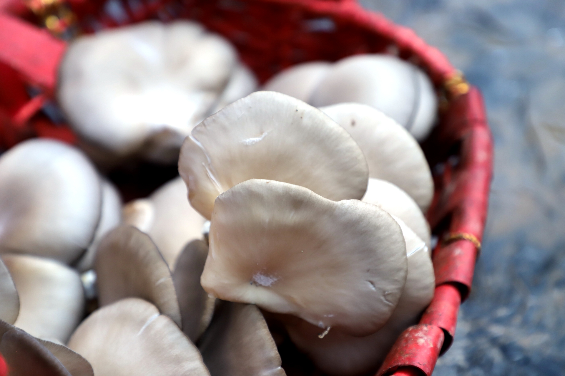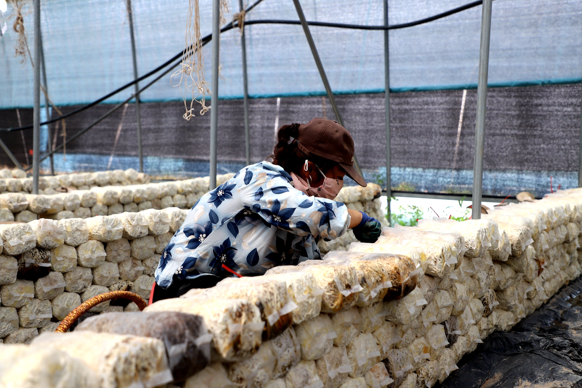 在大庄村食用菌示范园区,平菇采摘正进入旺季。一座座标准化大棚整齐排列,棚内菌棒排列有序,肥厚鲜嫩的平菇层层叠叠、长势喜人。村民们熟练地采摘成熟平菇,分拣、装筐、搬运一气呵成,新鲜的平菇很快堆满筐篮,即将运往市场。小小的平菇,不仅盘活了闲置资源,更带动周边群众就近务工,实现家门口增收致富。