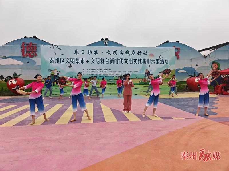 新天水讯 据秦州区融媒体中心消息 4月27日,秦州区“文明集市+文明舞台”新时代文明实践集中示范活动在天水镇草莓小镇举行。活动以“政府搭台、志愿者摆摊、百姓赶集、文艺润心”的模式,将文明服务、文化惠民与助农增收有机结合,把助农惠农服务送到群众身边,让文明新风浸润乡村沃土。