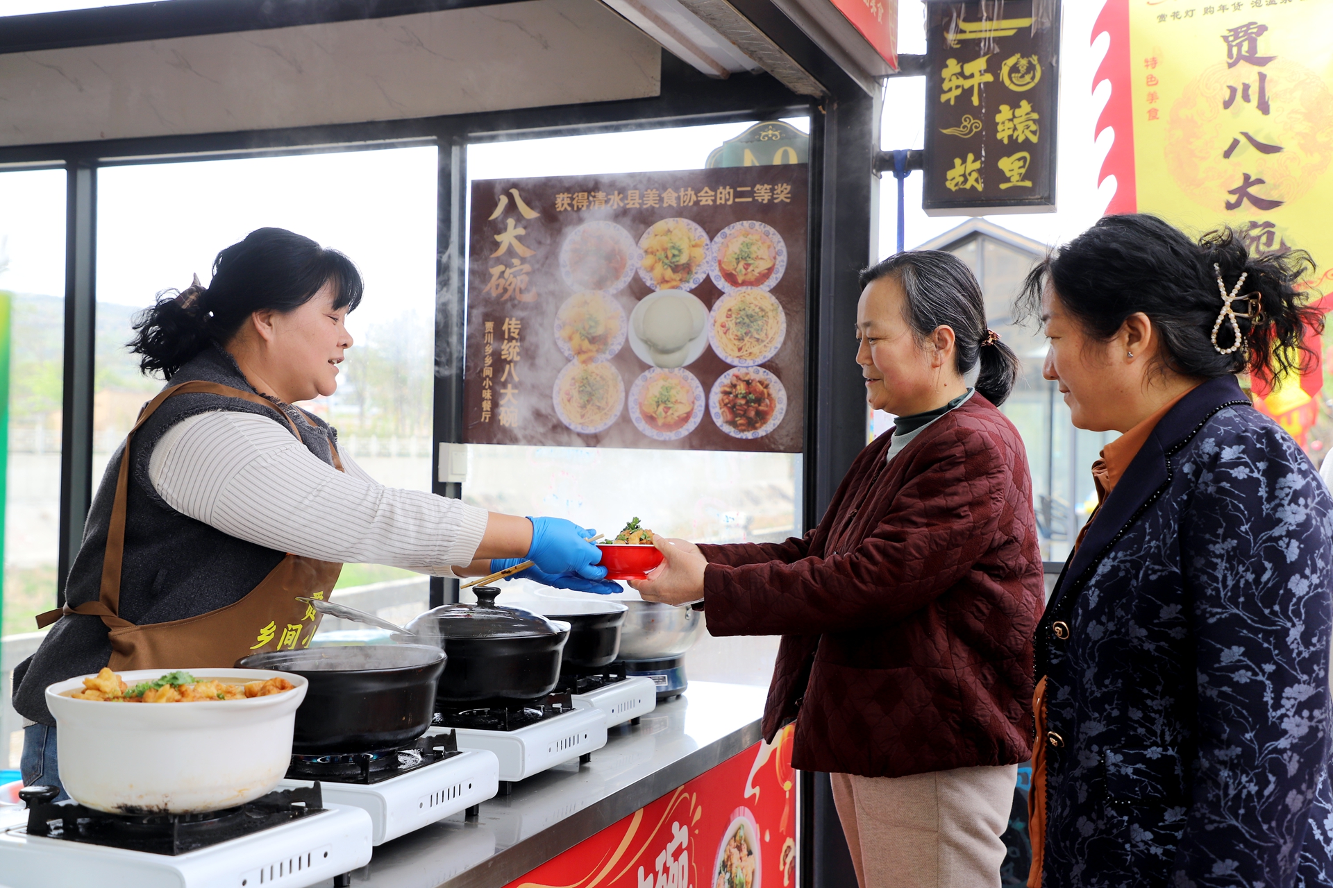 在贾川乡美食摊位前,传统八大碗凭借地道风味成为热门打卡点,红烧肉肥而不腻、丸子软糯鲜香、酥肉外酥里嫩,搭配特色土豆粉,尽显清水传统饮食魅力,摊位前始终围满品鉴的食客。“这次活动我们乡间小味餐厅代表贾川乡给大家带来八大碗,这是咱们本地传统美食,口感地道,很受大家欢迎,欢迎各地游客来清水打卡品尝。”摊主赵雪芹一边忙碌,一边热情地向游客推介。